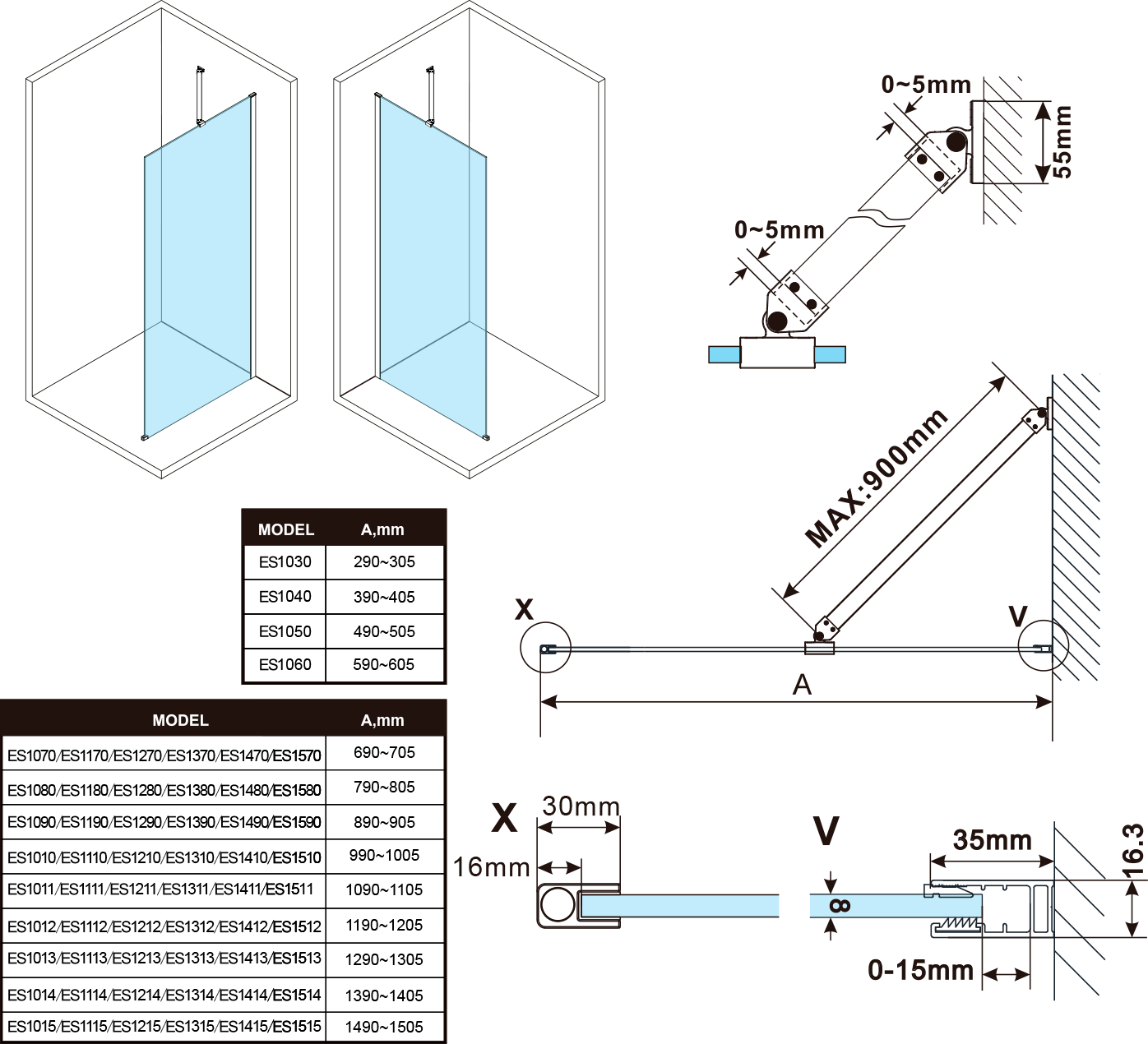 - Stěnové profily s tolerancí 15 mm usnadňují stabilní montáž zástěn, instalace je možná na dlažbu nebo sprchovou vaničku