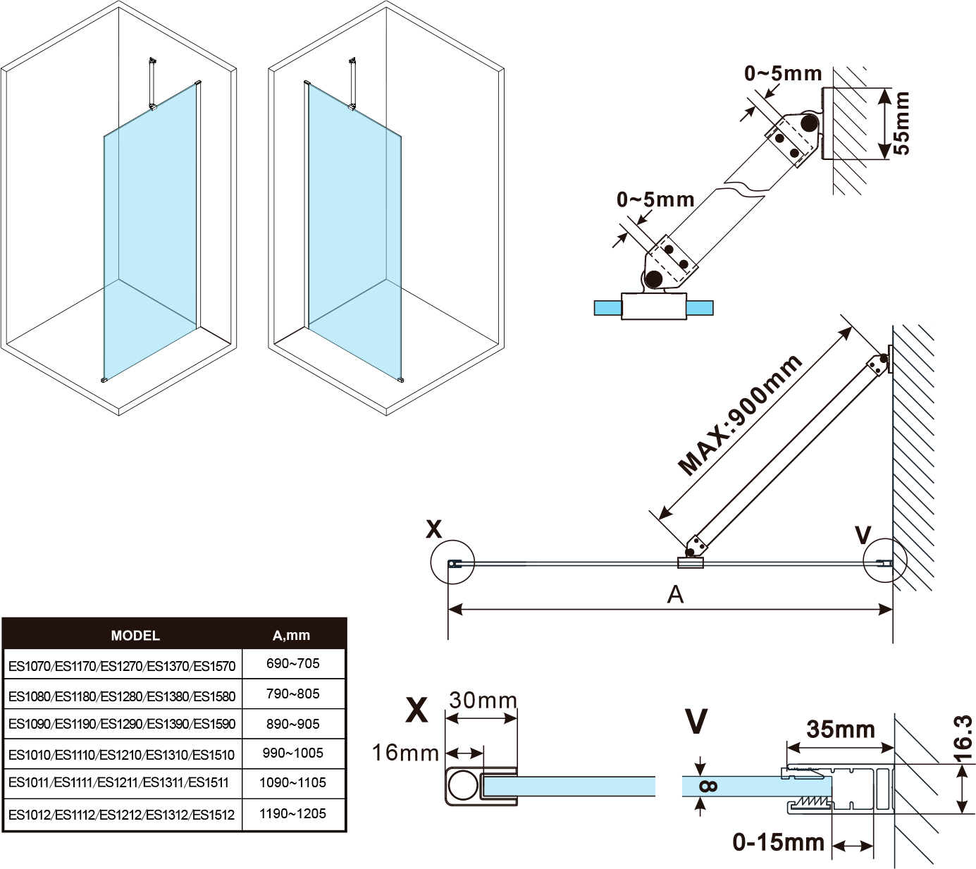 - Stěnové profily s tolerancí 15 mm usnadňují stabilní montáž zástěn, instalace je možná na dlažbu nebo sprchovou vaničku
