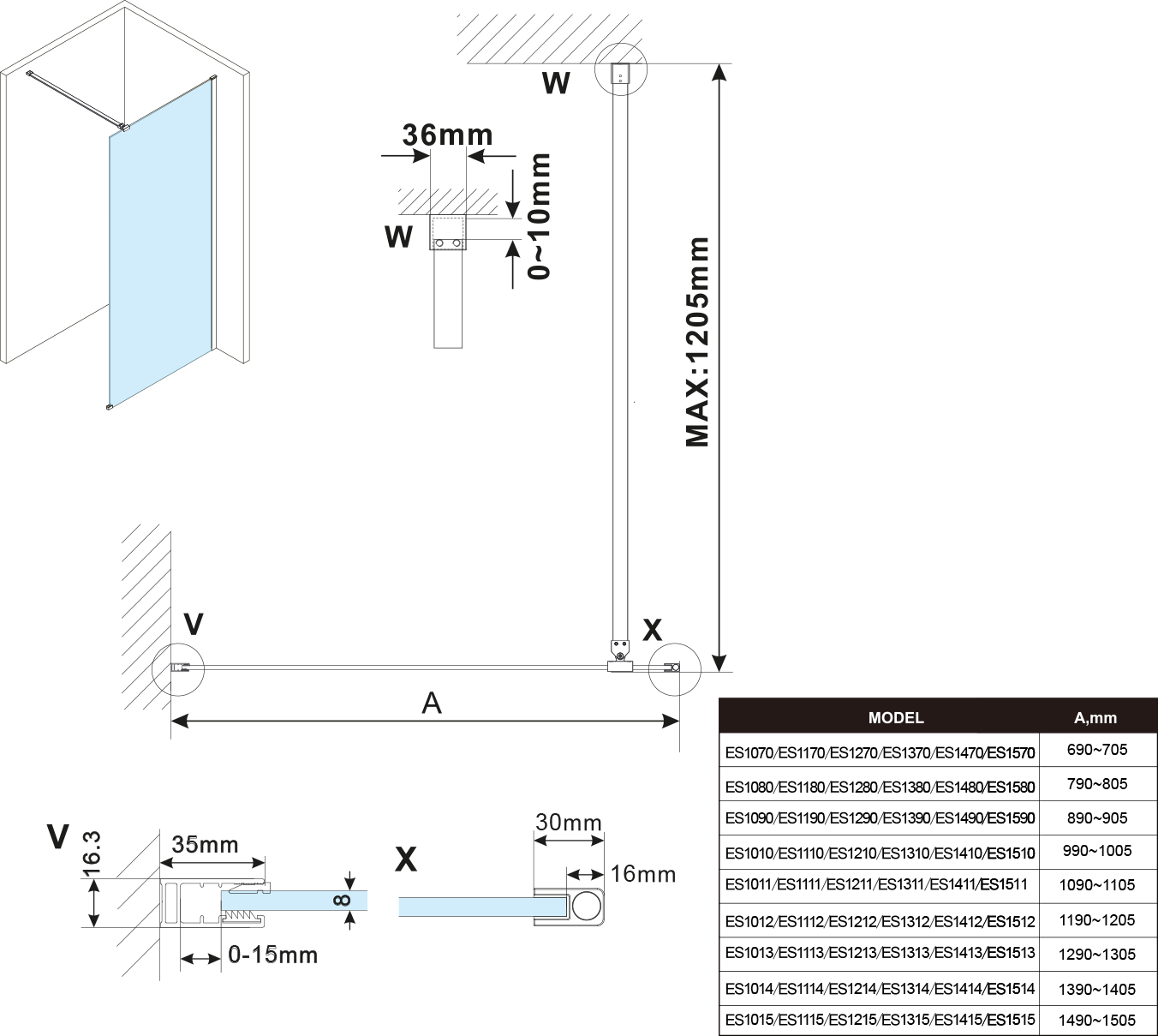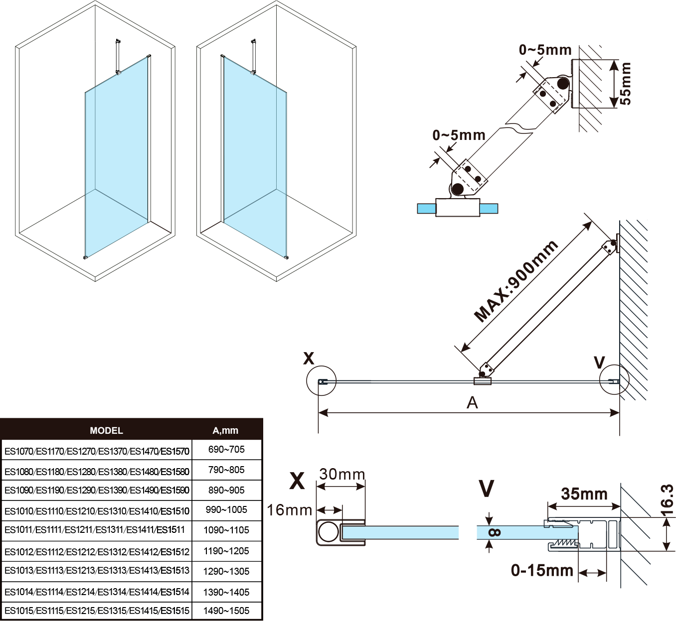 - Stěnové profily s tolerancí 15 mm usnadňují stabilní montáž zástěn, instalace je možná na dlažbu nebo sprchovou vaničku