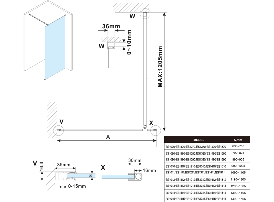 - Stěnové profily s tolerancí 15 mm usnadňují stabilní montáž zástěn, instalace je možná na dlažbu nebo sprchovou vaničku