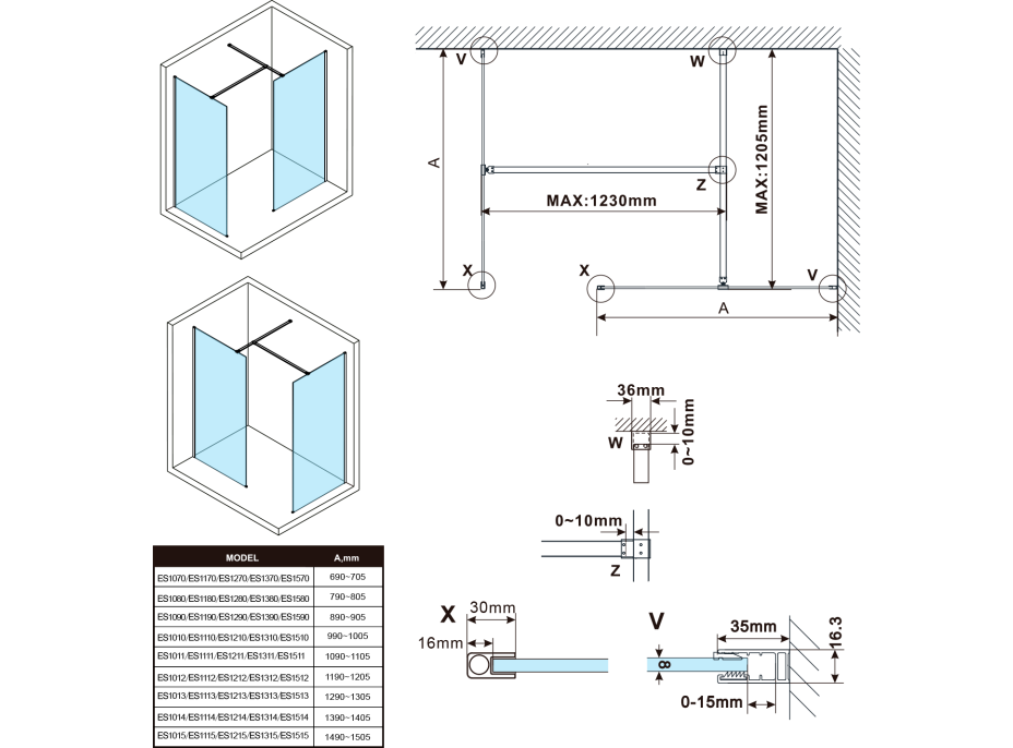 - Stěnové profily s tolerancí 15 mm usnadňují stabilní montáž zástěn, instalace je možná na dlažbu nebo sprchovou vaničku