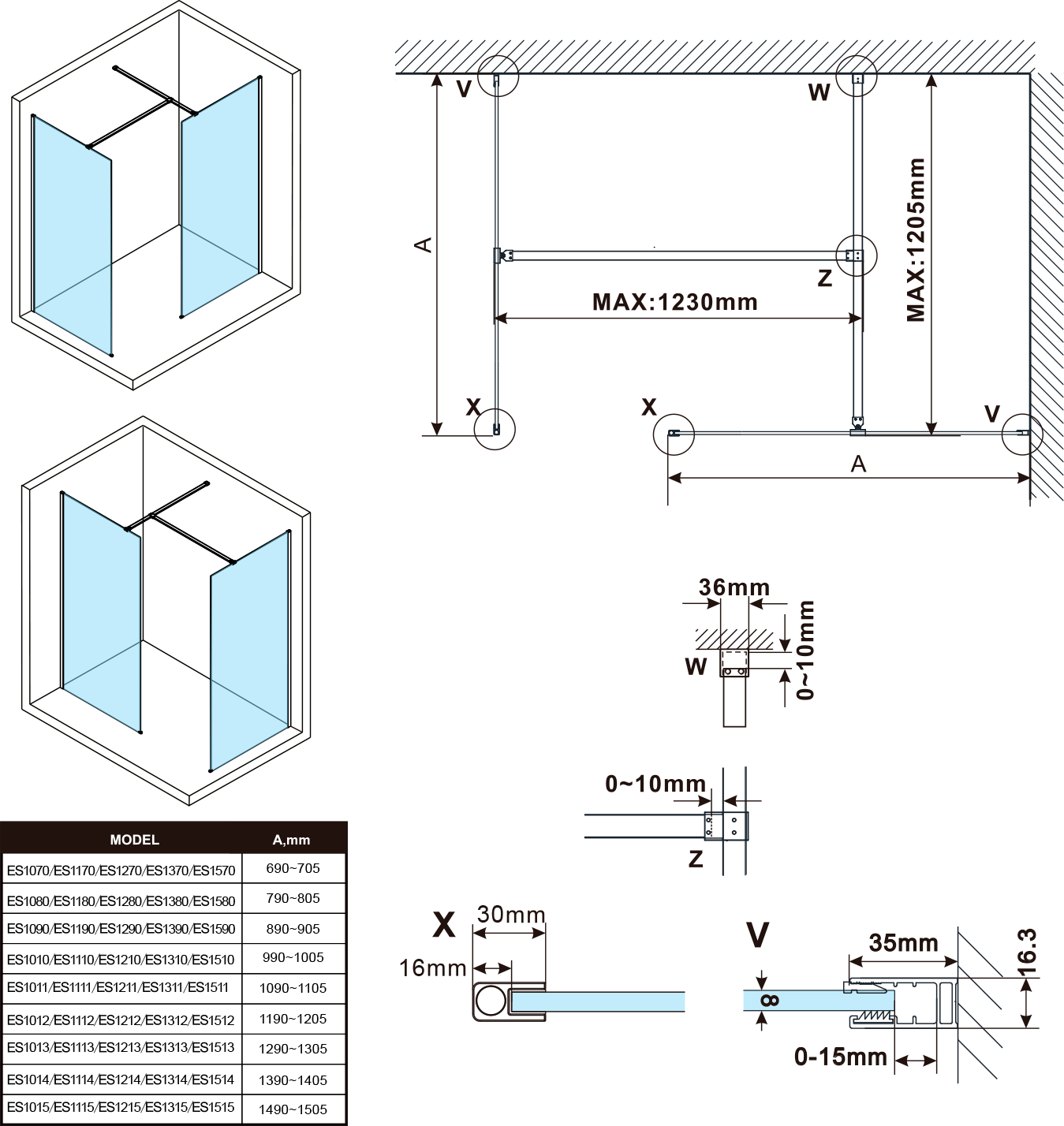 - Stěnové profily s tolerancí 15 mm usnadňují stabilní montáž zástěn, instalace je možná na dlažbu nebo sprchovou vaničku