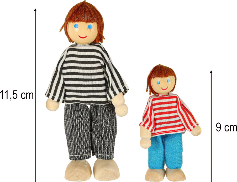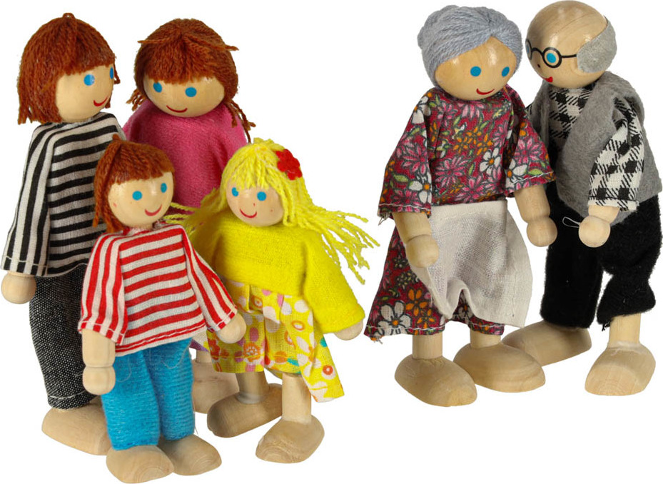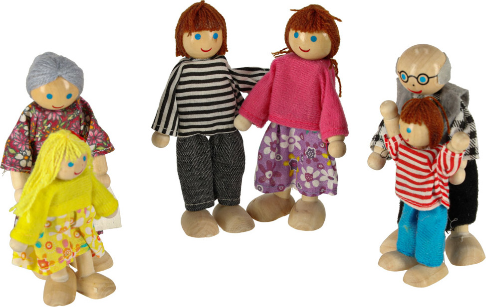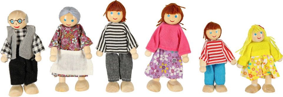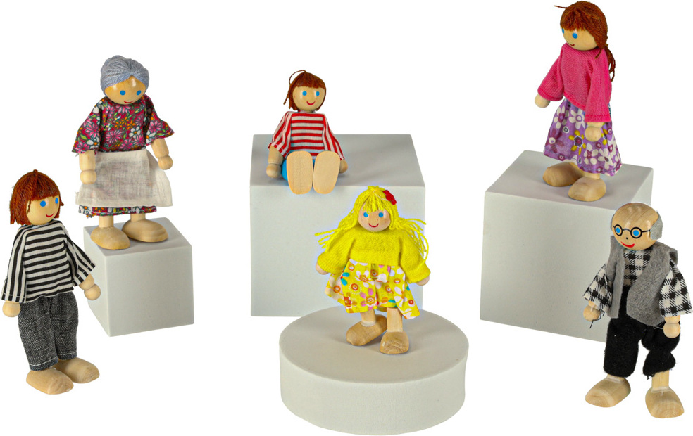 Tato sada panenek je perfektním doplňkem do domečku pro panenky. Šest panenek tvoří třígenerační rodinu: prarodiče, rodiče a děti. Panenky se liší velikostí, menší měří 9 cm a větší 11,5 cm, takže se perfektně hodí do většiny domečků pro panenky. Flexibilní ruce a nohy umožňují volné umístění panenek na nábytek, což hře dodává realistický pocit. Každá postavička má na sobě barevný polyesterový oblek. Sada podporuje rozvoj jemné motoriky, představivosti a hraní rolí u dětí.