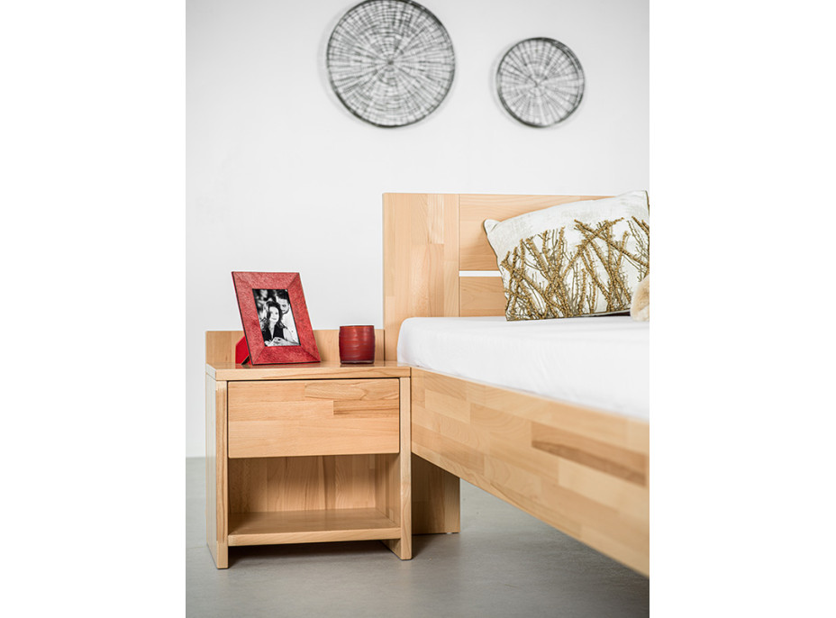 K posteli si můžete dokoupit prostorný šuplík do čela postele na kolečkách nebo noční stolky v různých provedeních.