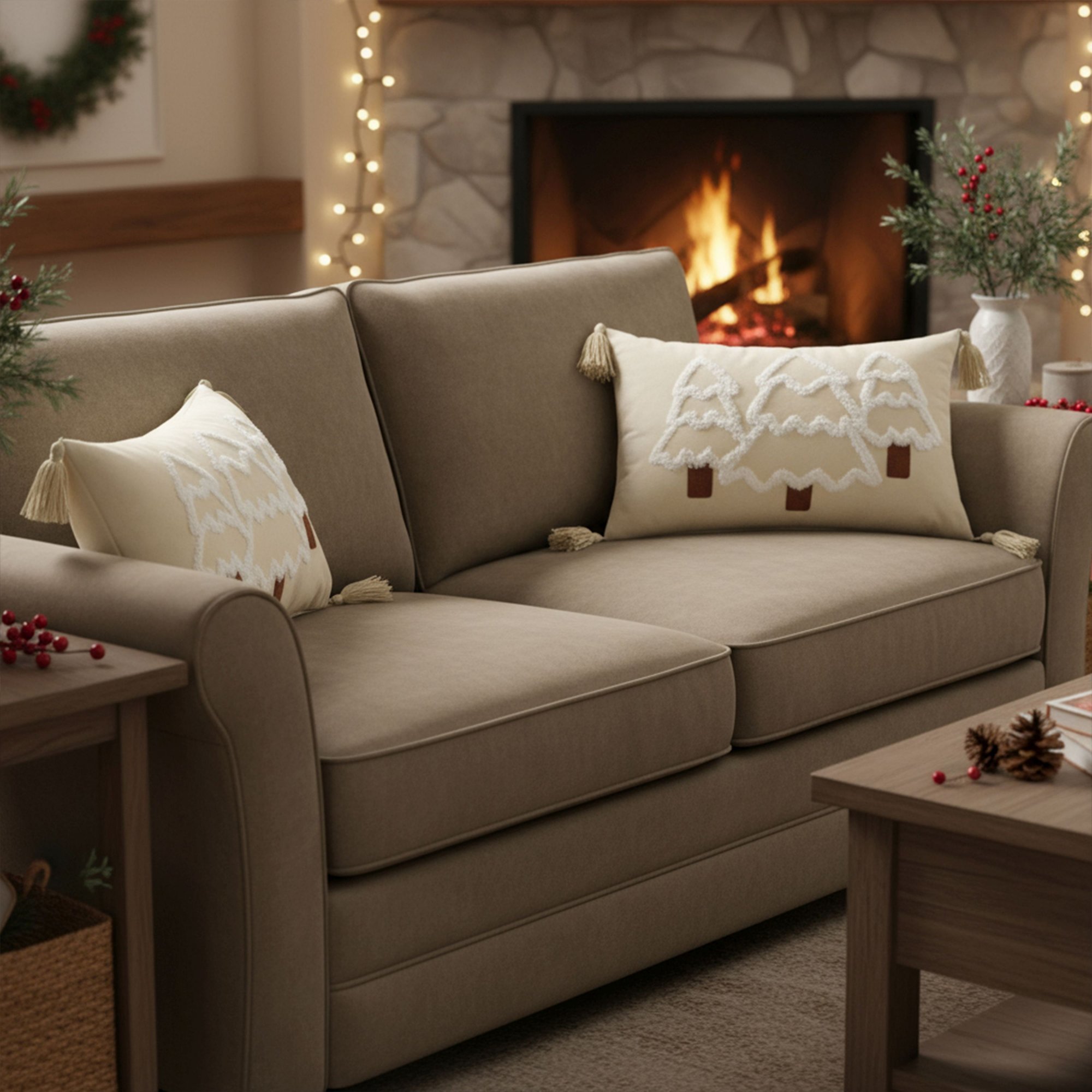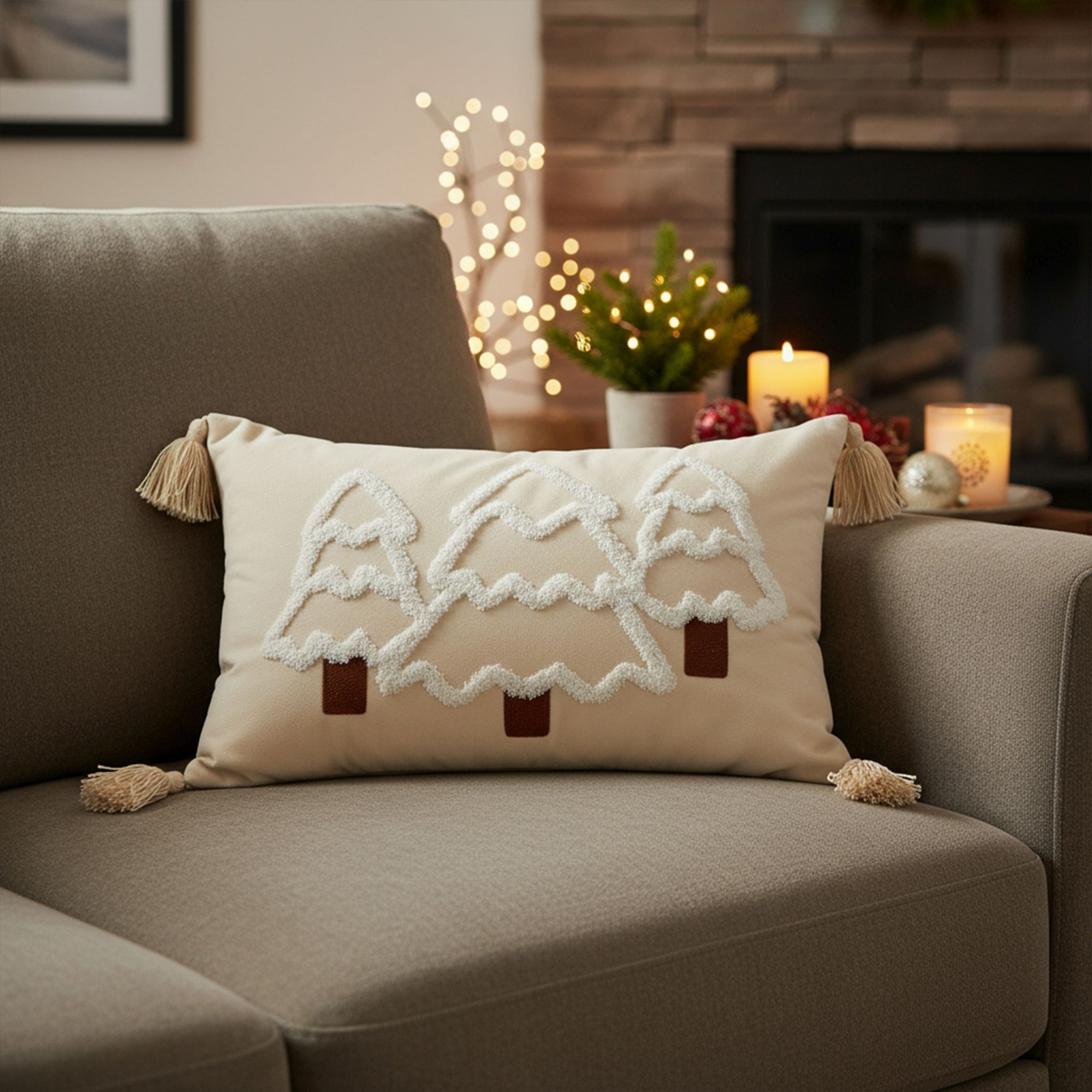 Tento elegantní sametový povlak na polštář má výšivku a aplikaci s motivem stromku na přední straně, což polštáři dodává trojrozměrný efekt a jemný lesk. Každý ze čtyř rohů má třáseň, která polštáři dodává sváteční charakter a nádech lehkosti. Tento model je ideální pro zimní a vánoční výzdobu, ale také jako stylový doplněk do klidných, světlých interiérů po celou sezónu.