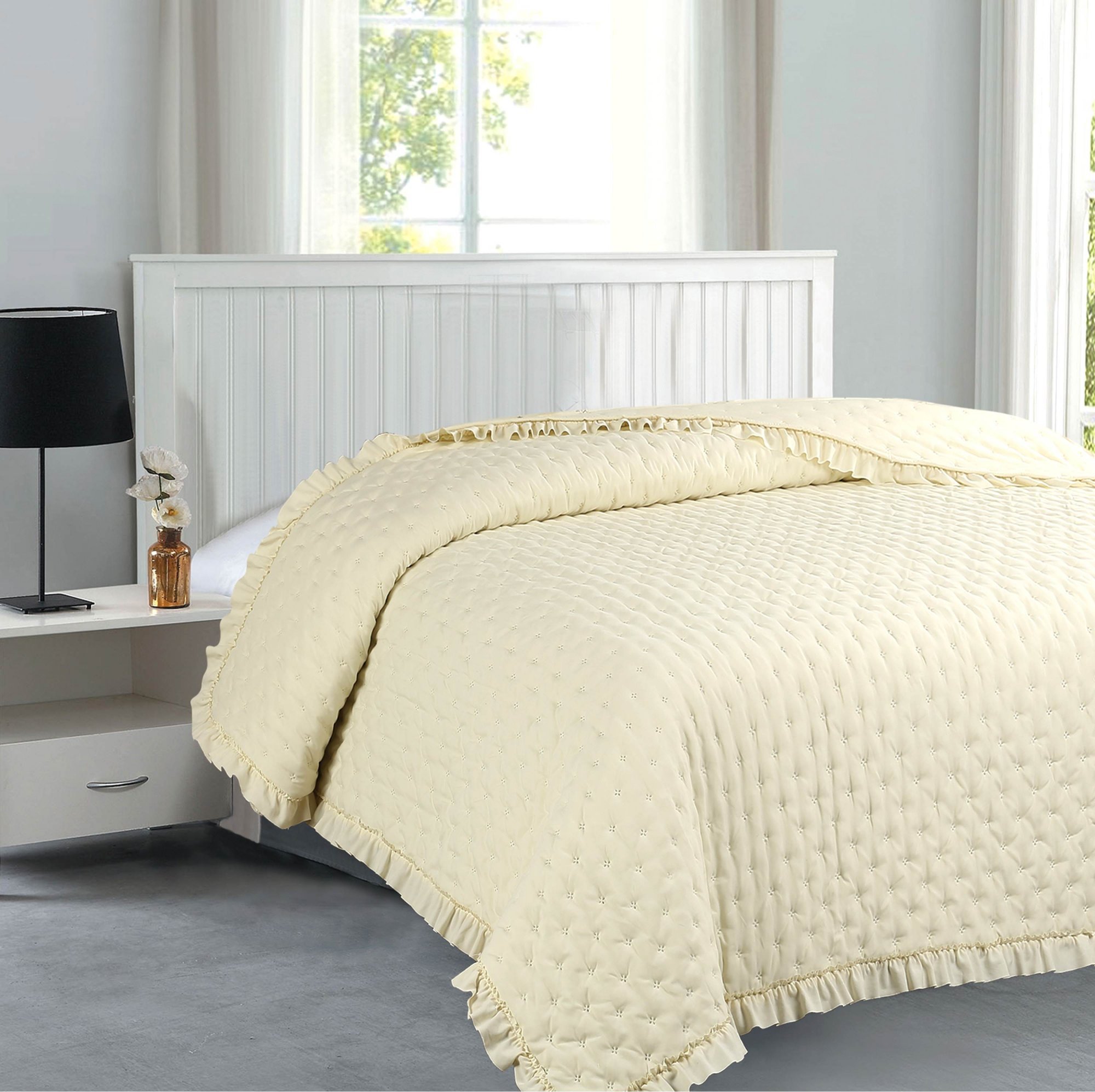 Dodejte vaší ložnici nádech romantického kouzla s přehozem RITA. Tento elegantní, třívrstvý prošívaný přehoz zaujme svým decentním designem a důrazem na detail. Vyroben ze 100% vysoce kvalitního polyesteru, je mimořádně měkký, lehký a příjemný na dotek. Jemné prošívání mu dodává elegantní nádech a zabraňuje posouvání výplně, zatímco ozdobný volánek po celém obvodu umožňuje, aby přehoz krásně splýval přes postel a dodává vašemu interiéru útulný, ženský nádech. Díky své třívrstvé konstrukci přehoz RITA nejen zdobí, ale také chrání ložní prádlo před prachem a zajišťuje celoroční pohodlí.