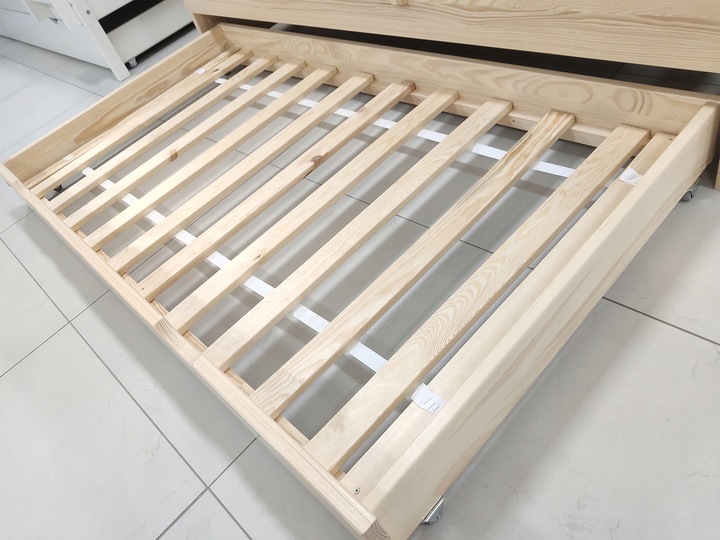 Kvalitní výsuvná přistýlka na kolečkách je vyrobena z borovicového dřeva. Dodávána včetně laťkového roštu.