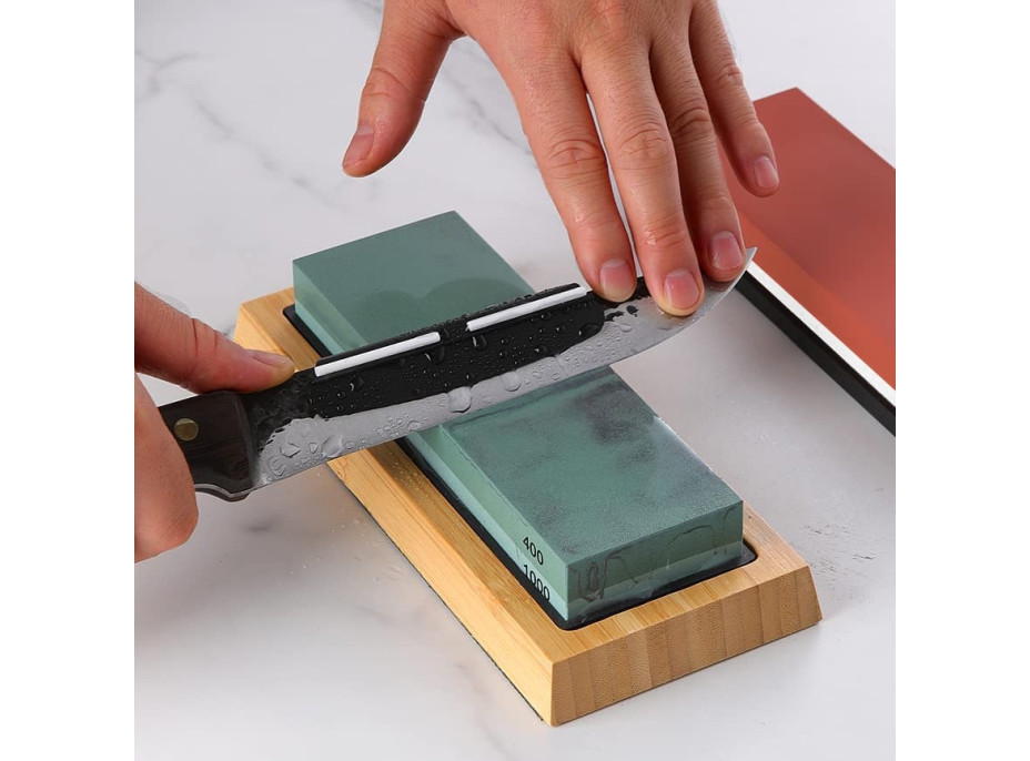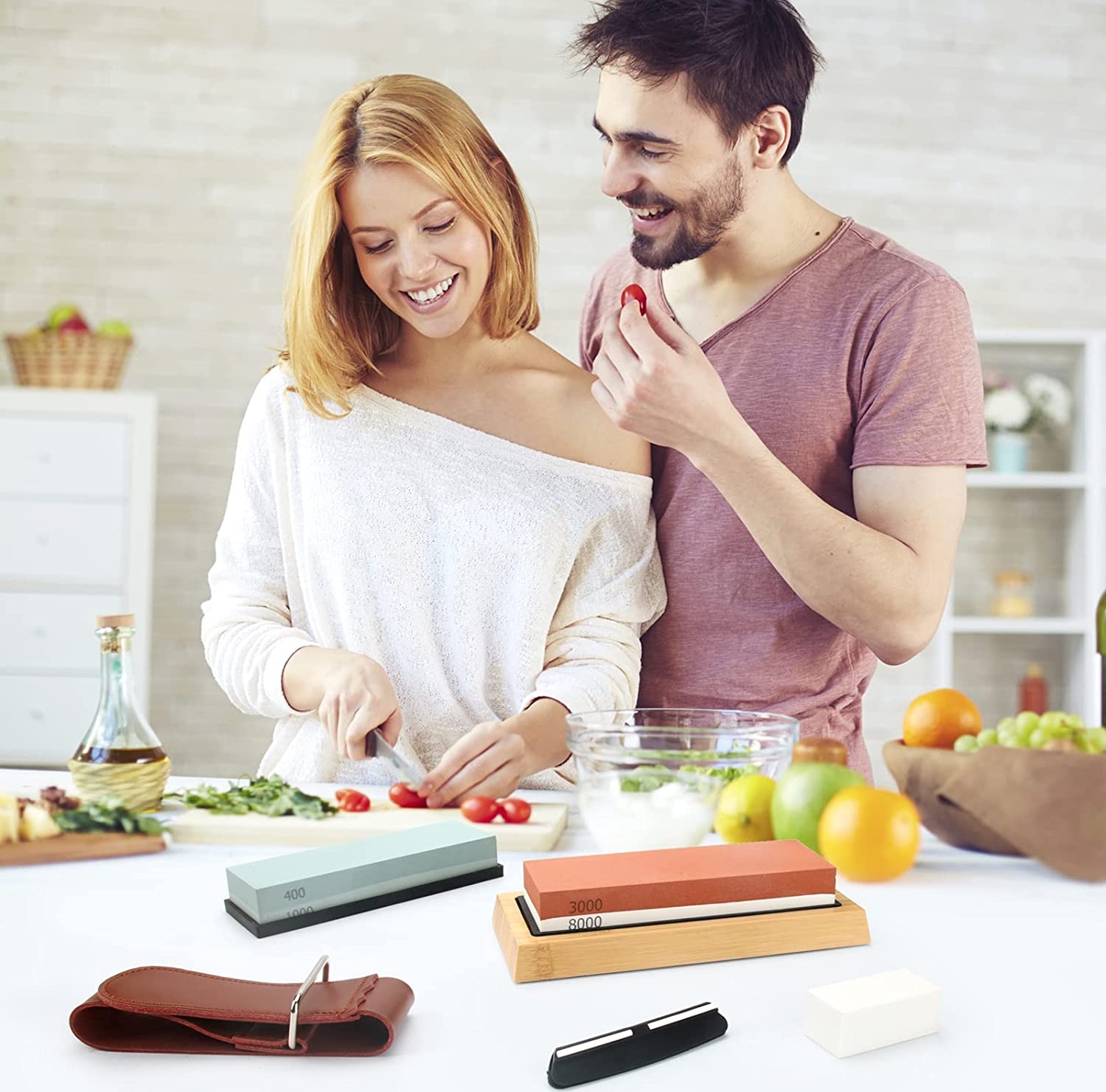 Všechny potřebné nástroje pro broušení v jedné profesionální sadě - vysoce kvalitní brusný kámen 400/1000 3000/8000, bambusová základna, úhlový kámen, vyrovnávací kámen, kožený řemen.