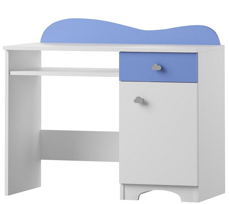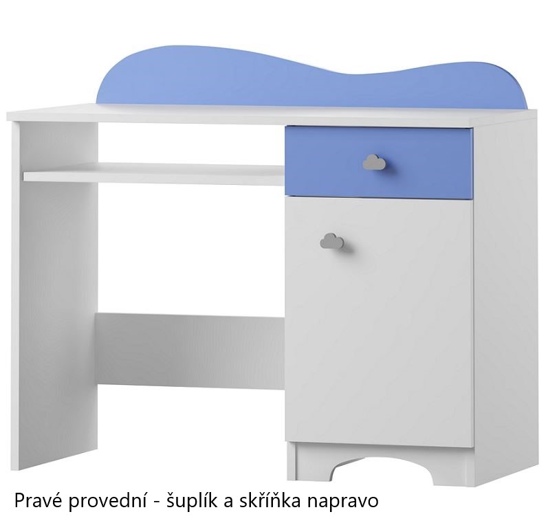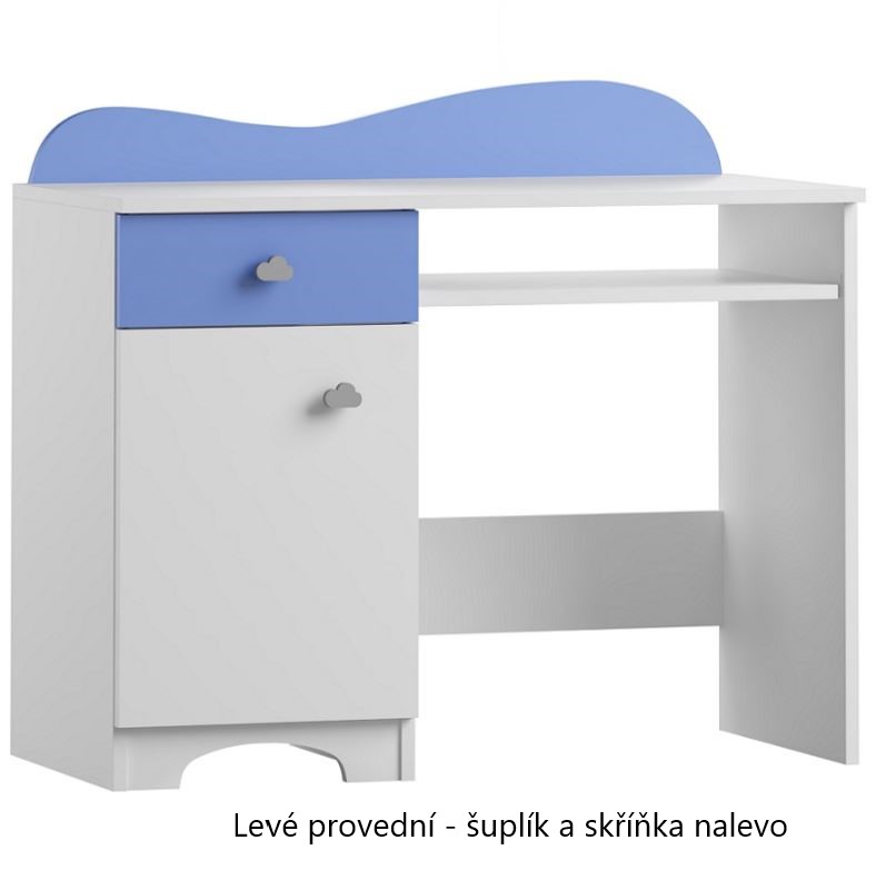 Praktický psací stůl kolekce CLOUDS se stane stylovým místem pro učení, psaní úkolů i tvoření v každém pokoji. Psací stůl je vyroben z kvalitních lamino desek o síle 18 mm. Hrany nábytku jsou zakončeny ABS/PVC materiálem, který jej chrání před mechanickým poškozením a vlhkostí. Stůl kombinuje bílou barvu s čelem šuplíku a ozdobným čelem v zadní části v odstínu, který si můžete vybrat z naší bohaté nabídky. Stůl obsahuje šuplík, skříňku s policí a výsuvnou polici pro klávesnici počítače. Umístění šuplíku a skříňky lze volit na pravou nebo levou stranu. Čela dvířek a šuplíku jsou osazena plastovými úchyty ve tvaru mráčku, charakteristickými pro celou kolekci. Úchyty dodávají nábytku jedinečný charakter a styl. Vyberte si kombinaci nábytku kolekce CLOUDS přesně podle představ vašich dětí!