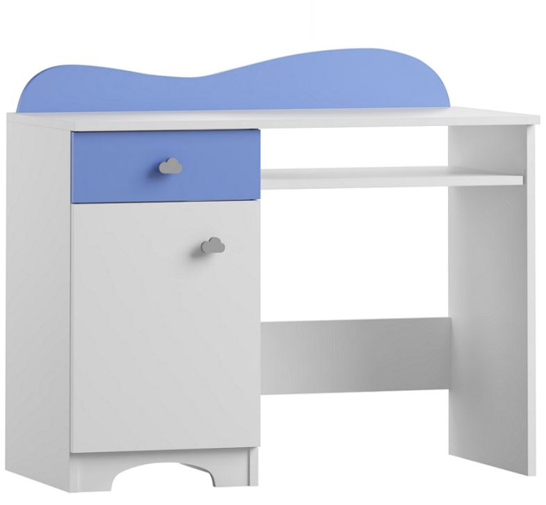 Praktický psací stůl kolekce CLOUDS se stane stylovým místem pro učení, psaní úkolů i tvoření v každém pokoji. Psací stůl je vyroben z kvalitních lamino desek o síle 18 mm. Hrany nábytku jsou zakončeny ABS/PVC materiálem, který jej chrání před mechanickým poškozením a vlhkostí. Stůl kombinuje bílou barvu s čelem šuplíku a ozdobným čelem v zadní části v odstínu, který si můžete vybrat z naší bohaté nabídky. Stůl obsahuje šuplík, skříňku s policí a výsuvnou polici pro klávesnici počítače. Umístění šuplíku a skříňky lze volit na pravou nebo levou stranu. Čela dvířek a šuplíku jsou osazena plastovými úchyty ve tvaru mráčku, charakteristickými pro celou kolekci. Úchyty dodávají nábytku jedinečný charakter a styl. Vyberte si kombinaci nábytku kolekce CLOUDS přesně podle představ vašich dětí!