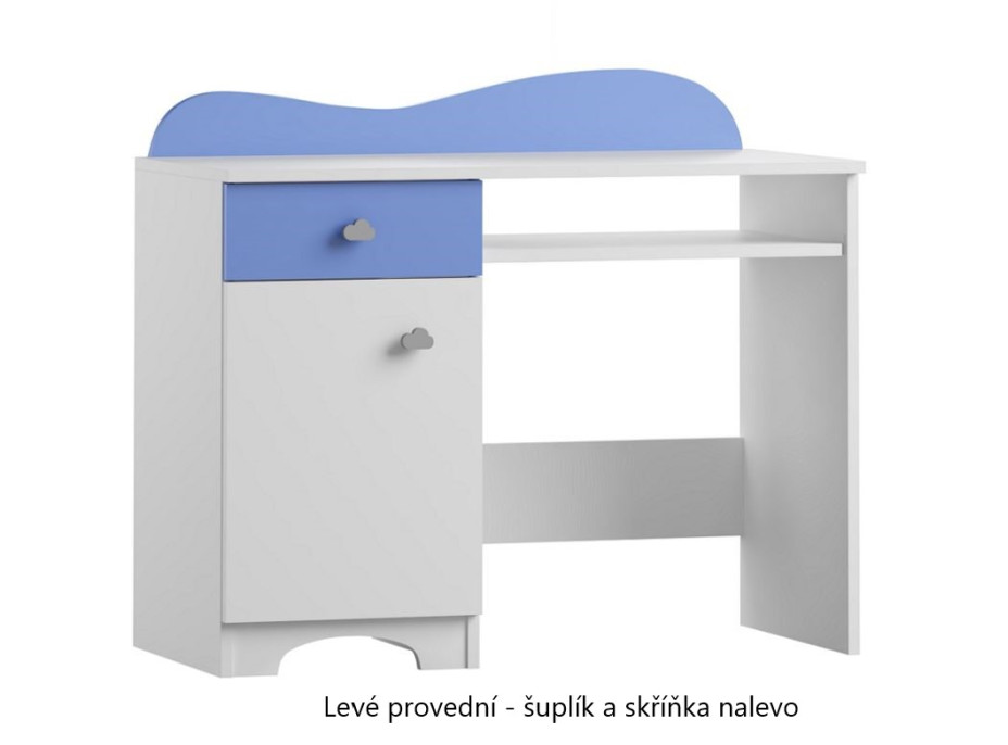 Praktický psací stůl kolekce CLOUDS se stane stylovým místem pro učení, psaní úkolů i tvoření v každém pokoji. Psací stůl je vyroben z kvalitních lamino desek o síle 18 mm. Hrany nábytku jsou zakončeny ABS/PVC materiálem, který jej chrání před mechanickým poškozením a vlhkostí. Stůl kombinuje bílou barvu s čelem šuplíku a ozdobným čelem v zadní části v odstínu, který si můžete vybrat z naší bohaté nabídky. Stůl obsahuje šuplík, skříňku s policí a výsuvnou polici pro klávesnici počítače. Umístění šuplíku a skříňky lze volit na pravou nebo levou stranu. Čela dvířek a šuplíku jsou osazena plastovými úchyty ve tvaru mráčku, charakteristickými pro celou kolekci. Úchyty dodávají nábytku jedinečný charakter a styl. Vyberte si kombinaci nábytku kolekce CLOUDS přesně podle představ vašich dětí!
