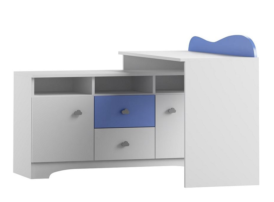 Jednoduchý psací stůl kolekce CLOUDS vyrobený z kvalitních lamino desek o síle 18 mm v bílé barvě kombinovaný s praktickou komodou utváří dostatečný prostor pro učení, psaní úkolů i tvoření v každém dívčím i chlapeckém pokoji. Barvu čela šuplíku a ozdobného čela na zadní straně stolu si můžete vybrat z bohaté nabídky barev. Hrany nábytku jsou zakončeny ABS/PVC materiálem, který jej chrání před mechanickým poškozením a vlhkostí. Stůl obsahuje praktickou komodu se třemi otevřenými policemi, dvěma šuplíky a dvěma skříňkami s policí po stranách. Díky této komodě vzniká dostatek místa pro učebnice či další nezbytnosti, které tak bude mít vaše dítě stále na dosah. U stolu lze volit orientaci - umístění komody na pravé nebo levé straně od stolu. Čela dvířek a šuplíků jsou osazena plastovými úchyty ve tvaru mráčků, charakteristickými pro celou kolekci. Úchyty dodávají nábytku jedinečný charakter a styl. Vyberte si kombinaci nábytku kolekce CLOUDS přesně podle představ vašich dětí!
