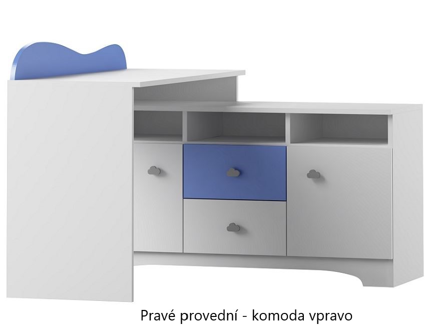 Jednoduchý psací stůl kolekce CLOUDS vyrobený z kvalitních lamino desek o síle 18 mm v bílé barvě kombinovaný s praktickou komodou utváří dostatečný prostor pro učení, psaní úkolů i tvoření v každém dívčím i chlapeckém pokoji. Barvu čela šuplíku a ozdobného čela na zadní straně stolu si můžete vybrat z bohaté nabídky barev. Hrany nábytku jsou zakončeny ABS/PVC materiálem, který jej chrání před mechanickým poškozením a vlhkostí. Stůl obsahuje praktickou komodu se třemi otevřenými policemi, dvěma šuplíky a dvěma skříňkami s policí po stranách. Díky této komodě vzniká dostatek místa pro učebnice či další nezbytnosti, které tak bude mít vaše dítě stále na dosah. U stolu lze volit orientaci - umístění komody na pravé nebo levé straně od stolu. Čela dvířek a šuplíků jsou osazena plastovými úchyty ve tvaru mráčků, charakteristickými pro celou kolekci. Úchyty dodávají nábytku jedinečný charakter a styl. Vyberte si kombinaci nábytku kolekce CLOUDS přesně podle představ vašich dětí!