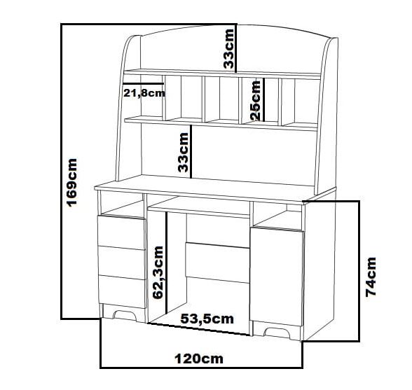 Praktický psací stůl kolekce CLOUDS vyrobený z kvalitních lamino desek o síle 18 mm v bílé barvě kombinované s barevnými čely šuplíků a dvířky vytvoří ideální prostor pro učení, psaní úkolů či tvoření v každém moderním pokoji. Hrany nábytku jsou zakončeny ABS/PVC materiálem, který jej chrání před mechanickým poškozením a vlhkostí. Stůl obsahuje dvě otevřené police, tři šuplíky a uzavřenou skříňku s policí na pravé straně. Díky praktickému policovému nástavci získáte více odkládacích prostor a vznikne dostatek místa pro učebnice či další nezbytnosti, které tak bude mít vaše dítě stále na dosah. Uprostřed stolu je výsuvná police pro klávesnici. Čela dvířek a šuplíků jsou osazena plastovými úchyty ve tvaru mráčků, charakteristickými pro celou kolekci. Úchyty dodávají nábytku jedinečný charakter a styl. Vyberte si kombinaci nábytku kolekce CLOUDS přesně podle představ vašich dětí!