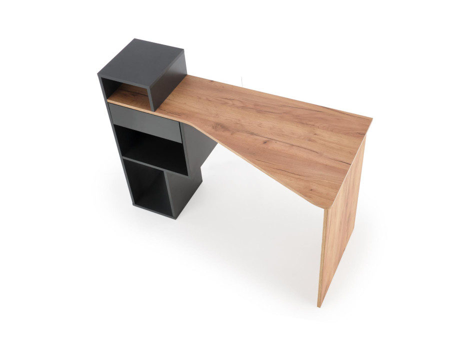 Moderní a praktický. To je hlavní charakteristika psacího stolu CONTI. Trendy kombinace dubu wotan a antracitové barvy vhodně doplní každou pracovnu i studentský pokoj. Díky praktickým rozměrům (122x57x90 cm) nabídne dostatek místa pro psaní a nezbytné maličkosti. V levé části stolu jsou tři otevřené poličky a jeden šuplík, kam můžete schovat vše, co nechcete, aby ostatní viděli. Stůl je vyroben z lamina, takže se dobře udržuje a snadno ho přemístíte. Je skvělým doplňkem do vašeho moderního bytu nebo domu.