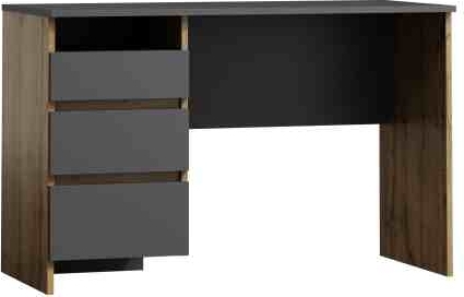 Moderní psací stůl vhodný nejen do každého studentského pokoje. Desky psacího stolu a poliček se skříňkou jsou vyrobeny z kvalitní lamino desky potažené fólií. Komínek šuplíků je skvělým funkčním doplňkem, díky kterému se nemusíte obávat o úložný prostor. Kontrast mezi dekorem dubu a tmavě šedé barvy dělá ze stolu nadčasový kousek, který je nejen funkční, ale i skvělým designovým doplňkem.
