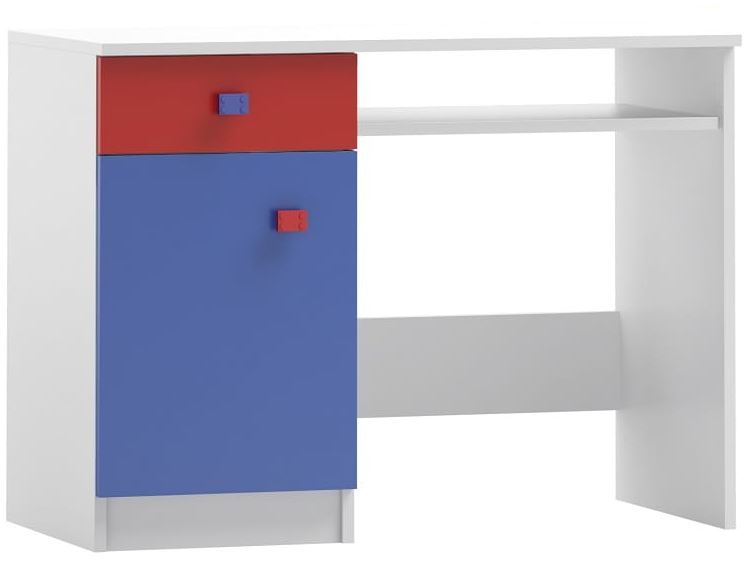 Praktický psací stůl kolekce MODE vyvedený v sytých barvách v kombinaci modré a červené se stane stylovým místem pro učení, psaní úkolů i tvoření v každém dívčím i chlapeckém pokoji. Psací stůl je vyroben z kvalitních lamino desek o síle 18 mm. Hrany nábytku jsou zakončeny ABS/PVC, které jej chrání před mechanickým poškozením a vlhkostí. Stůl obsahuje šuplík, skříňku s policí a výsuvnou polici pro klávesnici počítače. Umístění šuplíku a skříňky lze volit na pravou nebo levou stranu. Čela dvířek a šuplíku jsou osazena plastovými úchyty, charakteristickými pro celou kolekci. Úchyty dokonale ladí s barevnou přední stranou a dodávají nábytku jedinečný charakter a styl. Vyberte si kombinaci nábytku kolekce MODE přesně podle představ vašich dětí!