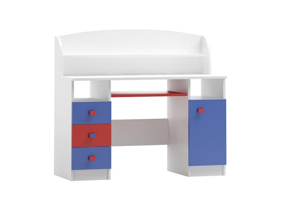 Praktický psací stůl kolekce MODE vyrobený z kvalitních lamino desek o síle 18 mm v bílé barvě kombinované s modrou a červenou vytvoří ideální prostor pro učení, psaní úkolů či tvoření v každém moderním pokoji. Hrany nábytku jsou zakončeny ABS/PVC, které jej chrání před mechanickým poškozením a vlhkostí. Stůl obsahuje dvě otevřené police, tři šuplíky a uzavřenou skříňku s policí na pravé straně. Díky praktickému nástavci s policí získáte více odkládacích prostor a vznikne dostatek místa pro učebnice či další nezbytnosti, které tak bude mít vaše dítě stále na dosah. Uprostřed stolu je výsuvná police pro klávesnici ve výrazné červené barvě. Čela dvířek a šuplíků jsou osazena plastovými úchyty, charakteristickými pro celou kolekci. Úchyty dokonale ladí s barevnou přední stranou a dodávají nábytku jedinečný charakter a styl. Vyberte si kombinaci nábytku kolekce MODE přesně podle představ vašich dětí!
