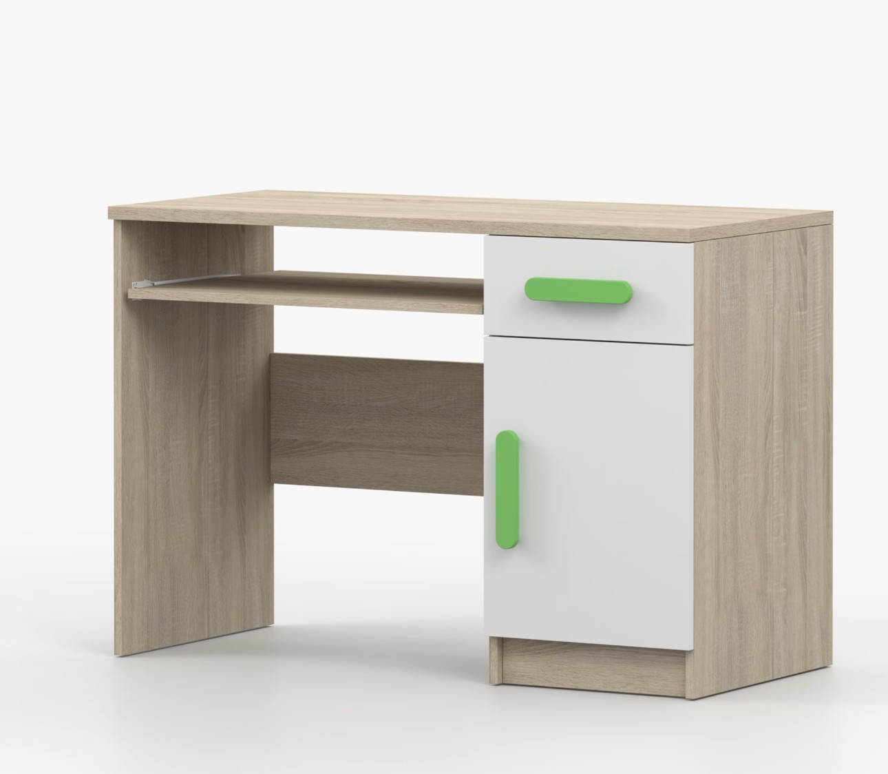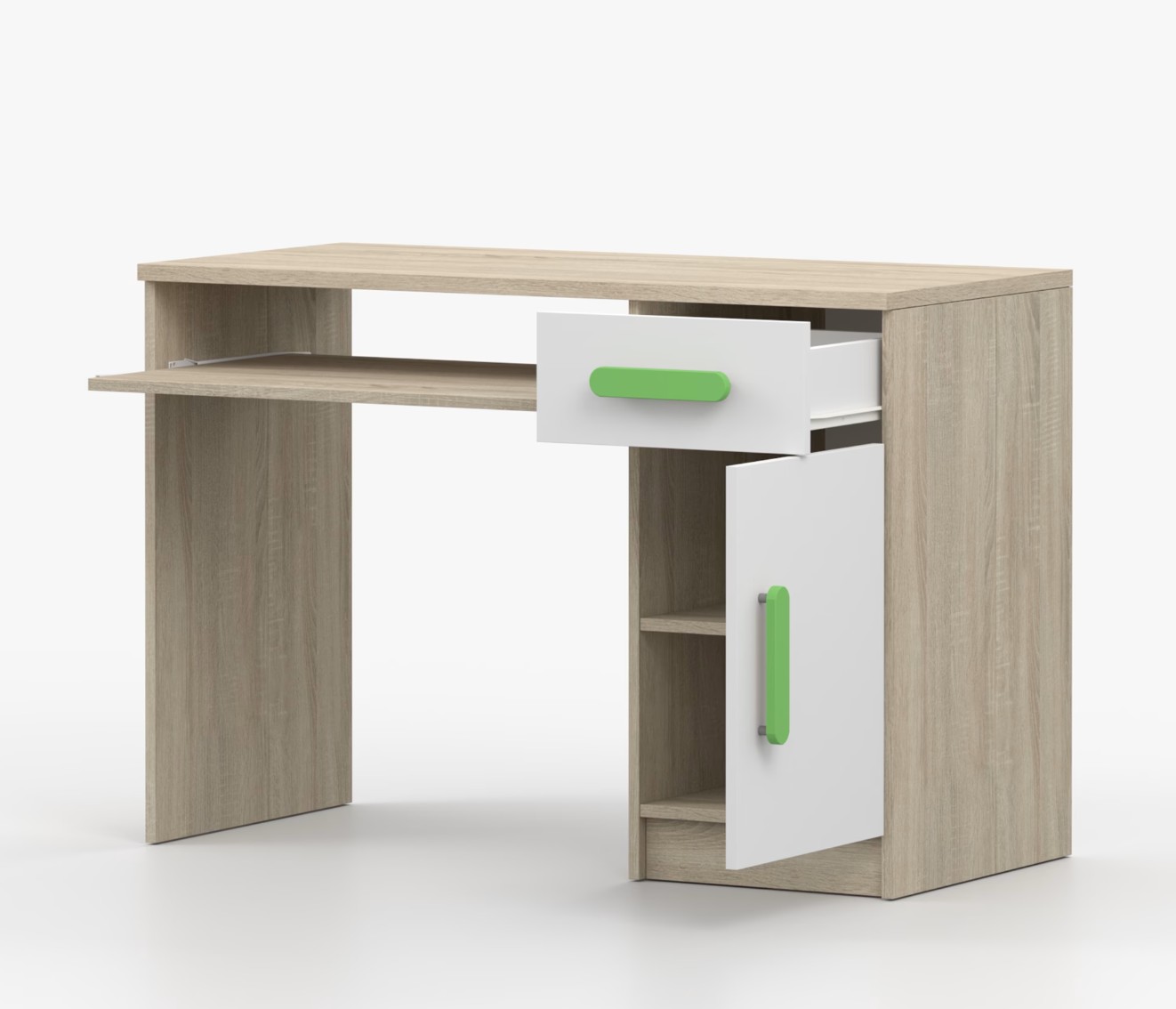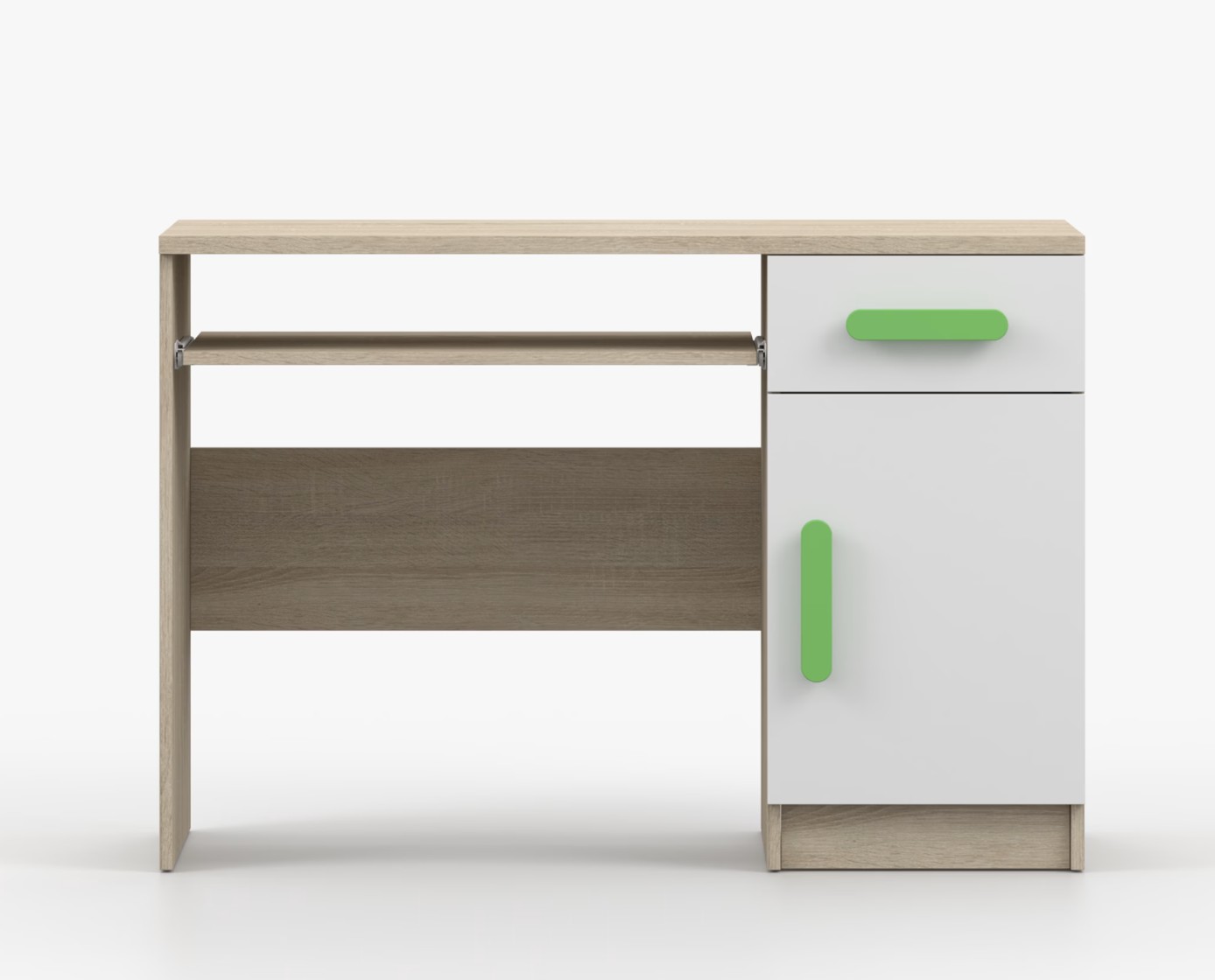 Pro studenty i kancelářské prostředí je psací stůl SCOUT ideální volbou. Nabízí velkou pracovní plochu, na které najdete dostatek místa pro práci i studium. Zásuvka pod pracovní deskou umožňuje uložení klávesnice počítače a šuplík na příslušenství usnadní organizaci pracovního prostoru. Praktická skříňka s policí je umístěna pod šuplíkem. Barevné úchytky z PVC přidávají zajímavý designový prvek k tomuto praktickému kusu nábytku.