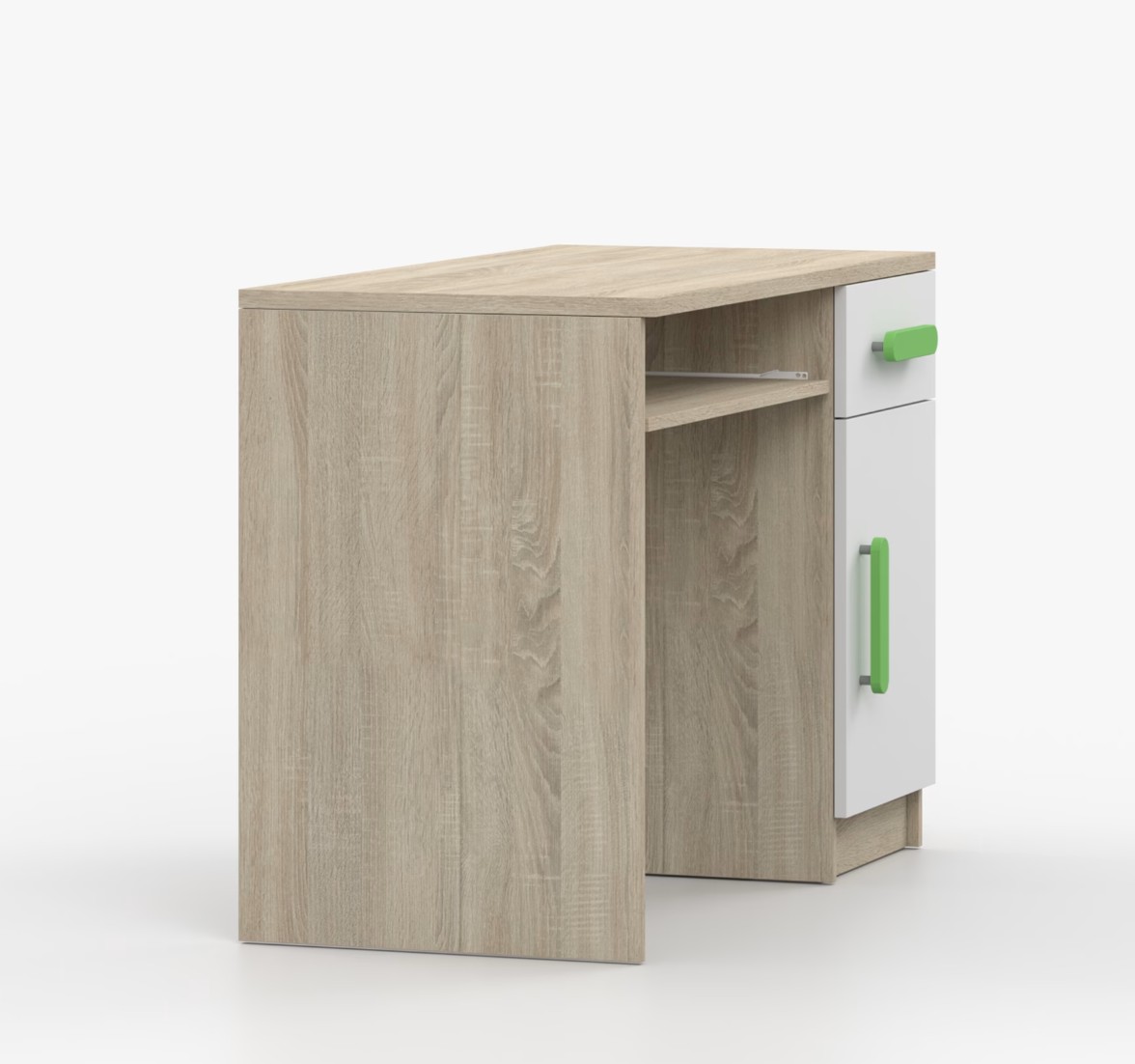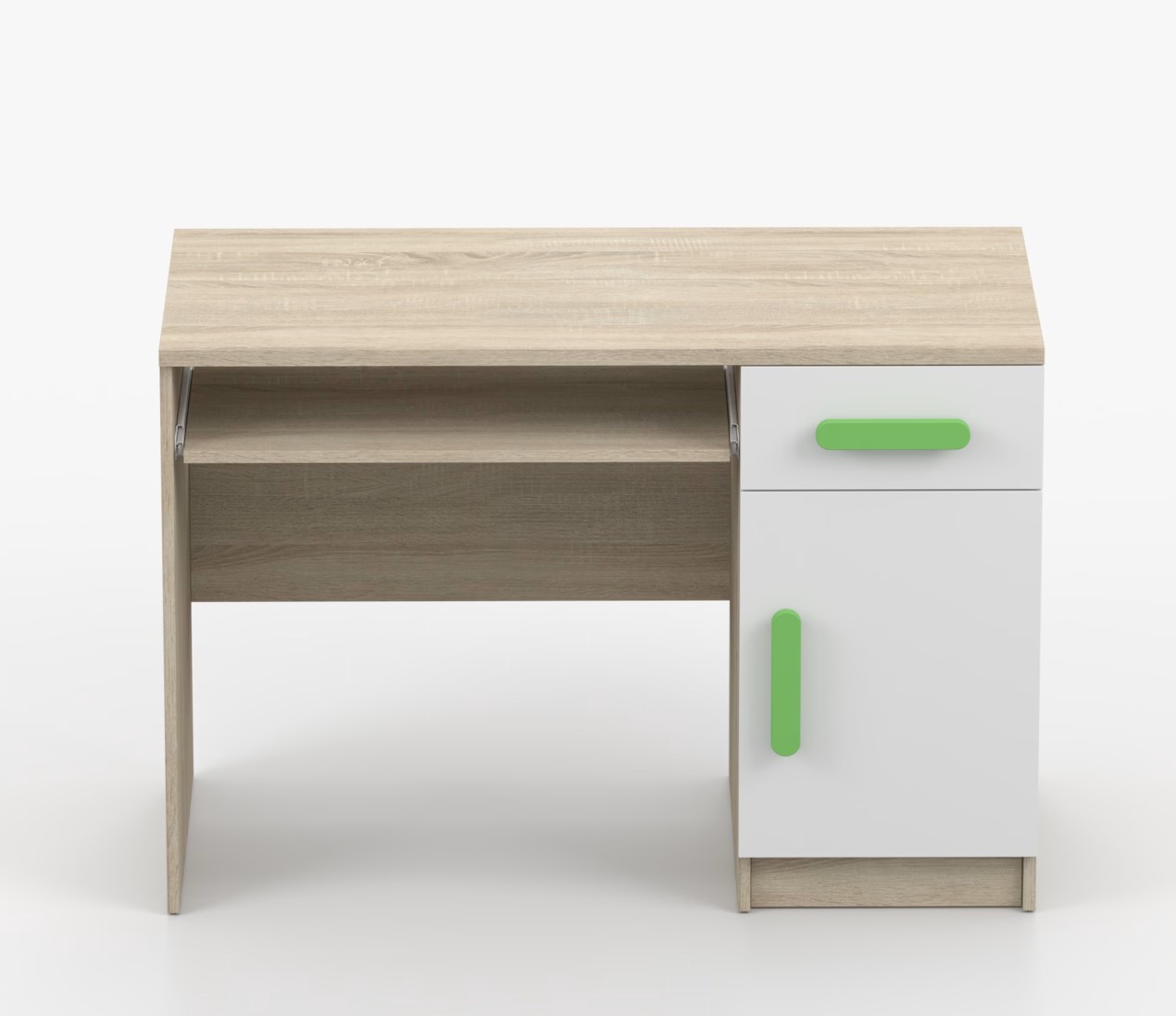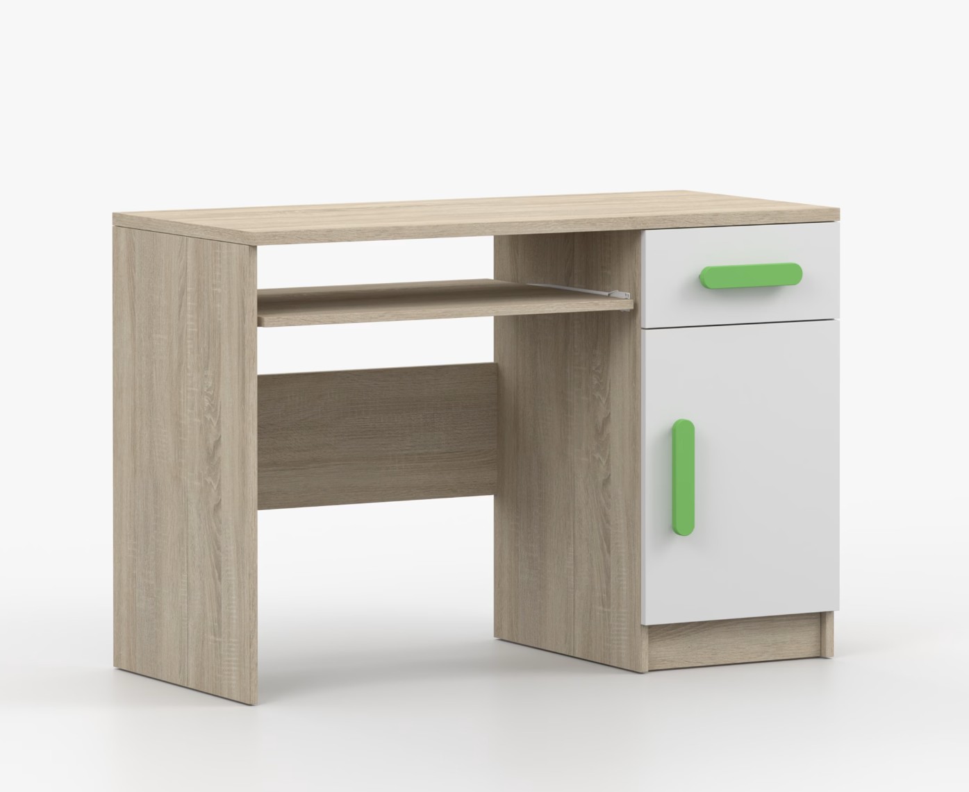 Pro studenty i kancelářské prostředí je psací stůl SCOUT ideální volbou. Nabízí velkou pracovní plochu, na které najdete dostatek místa pro práci i studium. Zásuvka pod pracovní deskou umožňuje uložení klávesnice počítače a šuplík na příslušenství usnadní organizaci pracovního prostoru. Praktická skříňka s policí je umístěna pod šuplíkem. Barevné úchytky z PVC přidávají zajímavý designový prvek k tomuto praktickému kusu nábytku.