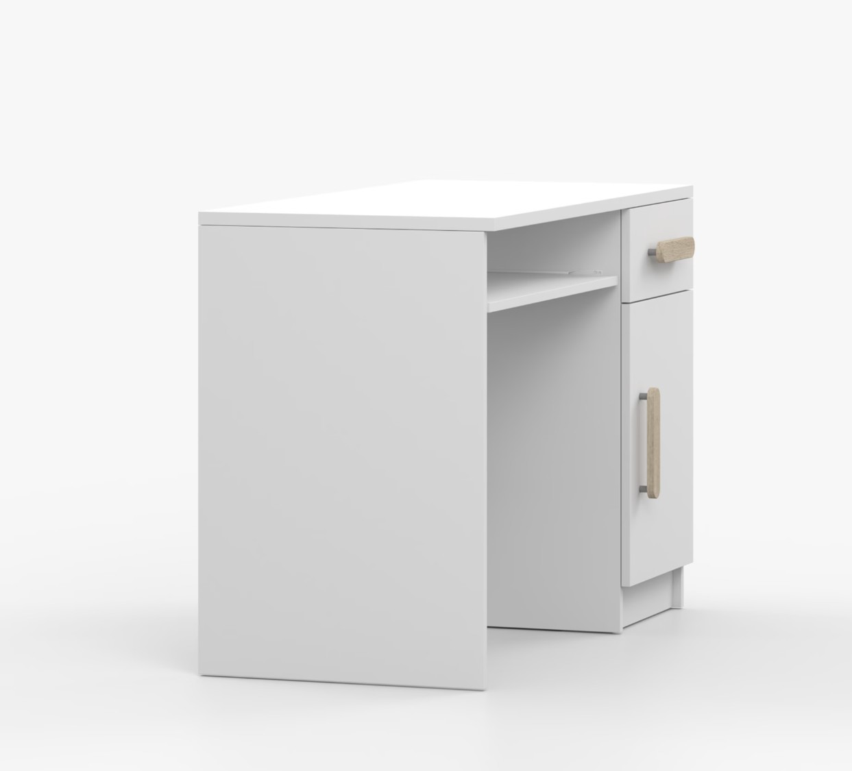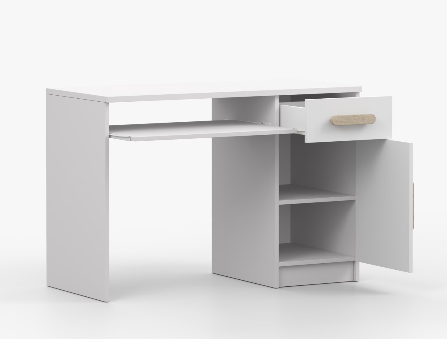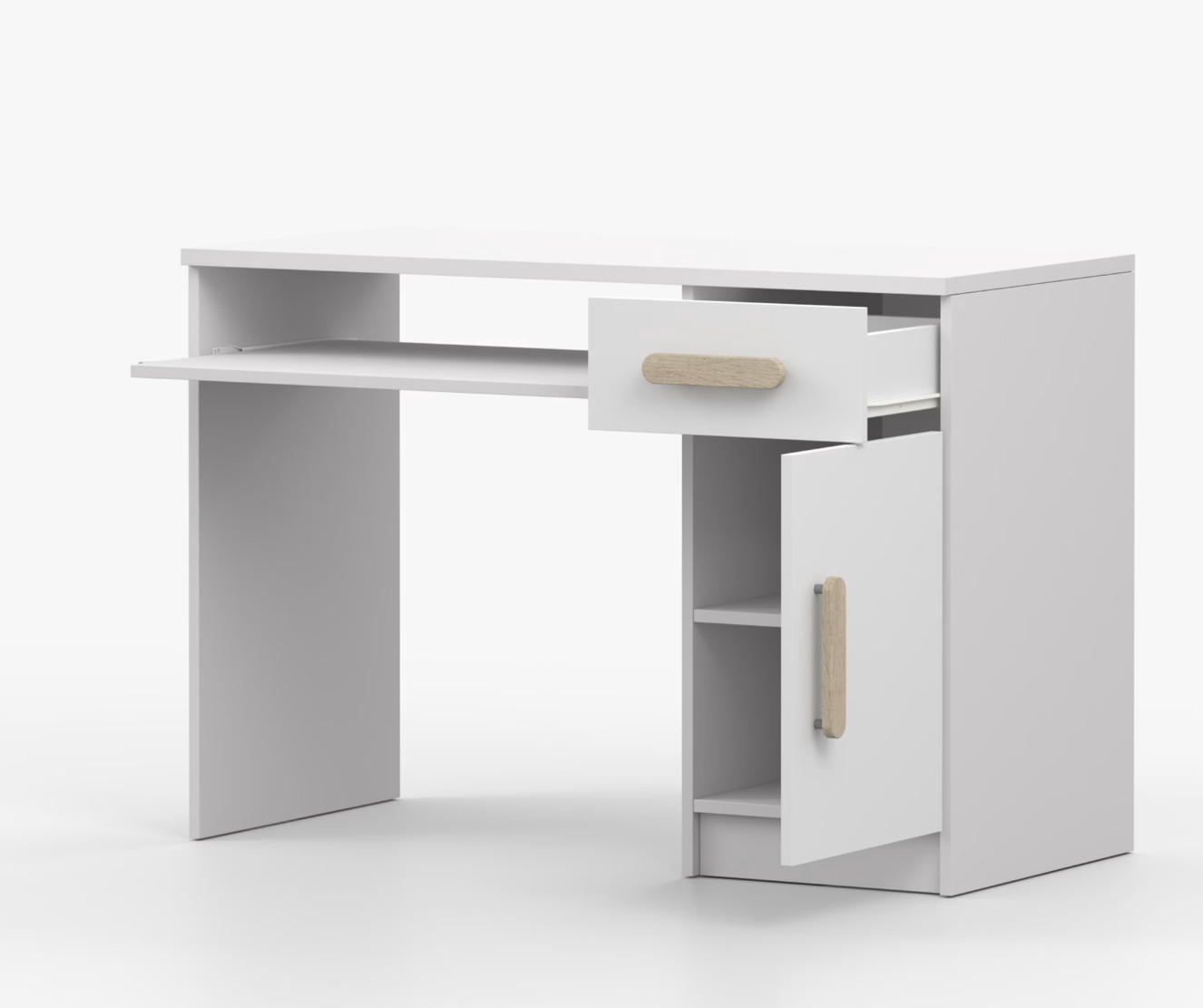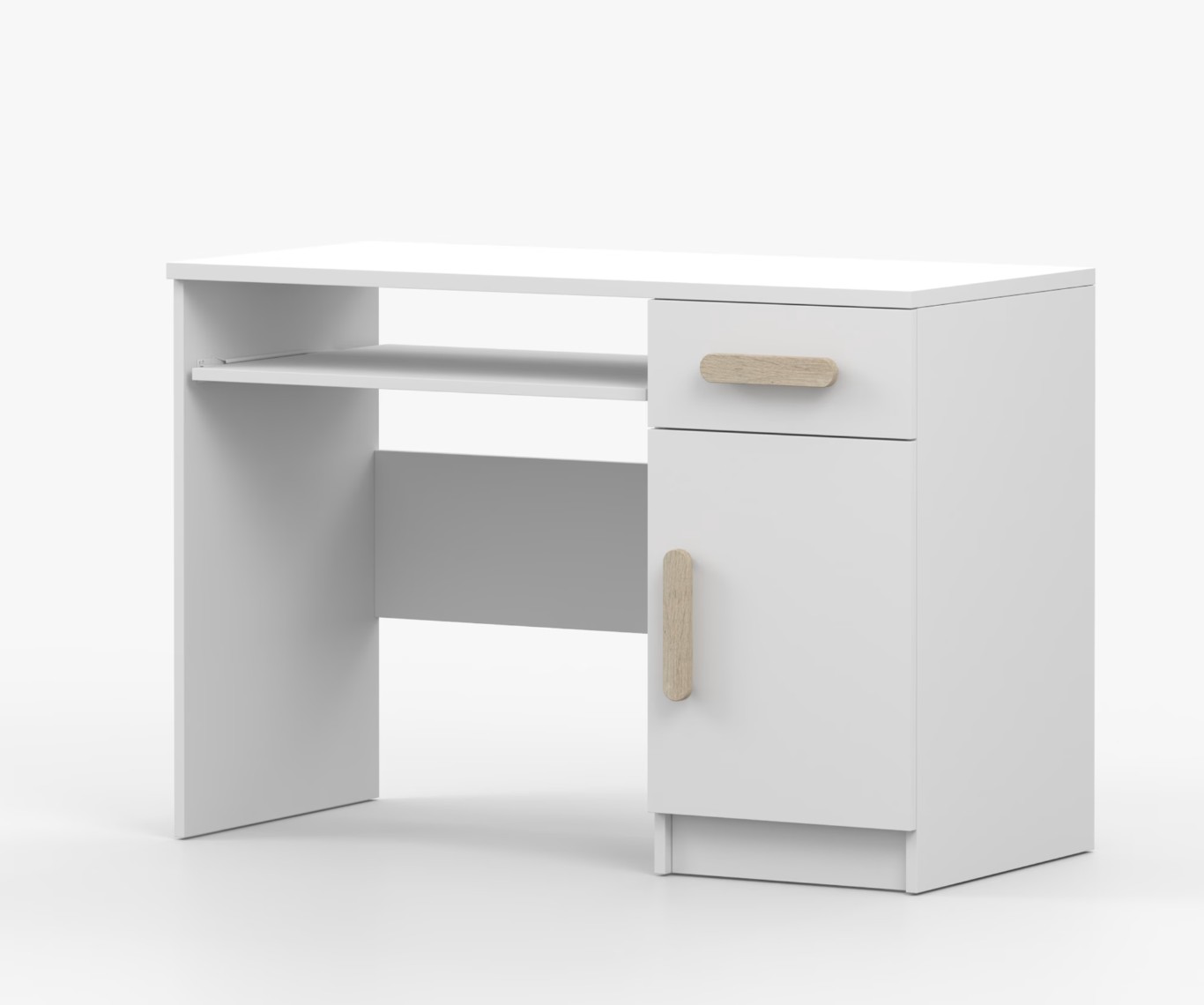 Pro studenty i kancelářské prostředí je psací stůl SMYK ideální volbou. Nabízí velkou pracovní plochu, na které najdete dostatek místa pro práci i studium. Zásuvka pod pracovní deskou umožňuje uložení klávesnice počítače a šuplík na příslušenství usnadní organizaci pracovního prostoru. Praktická skříňka s policí je umístěna pod šuplíkem. Barevné úchytky z PVC přidávají zajímavý designový prvek k tomuto praktickému kusu nábytku.