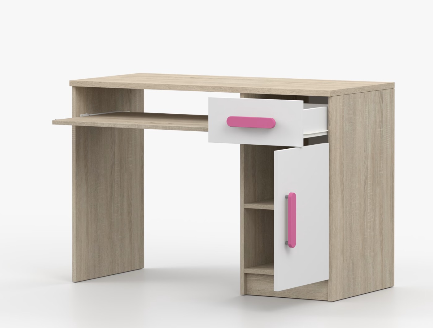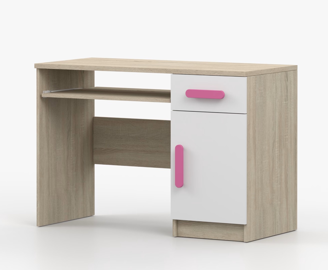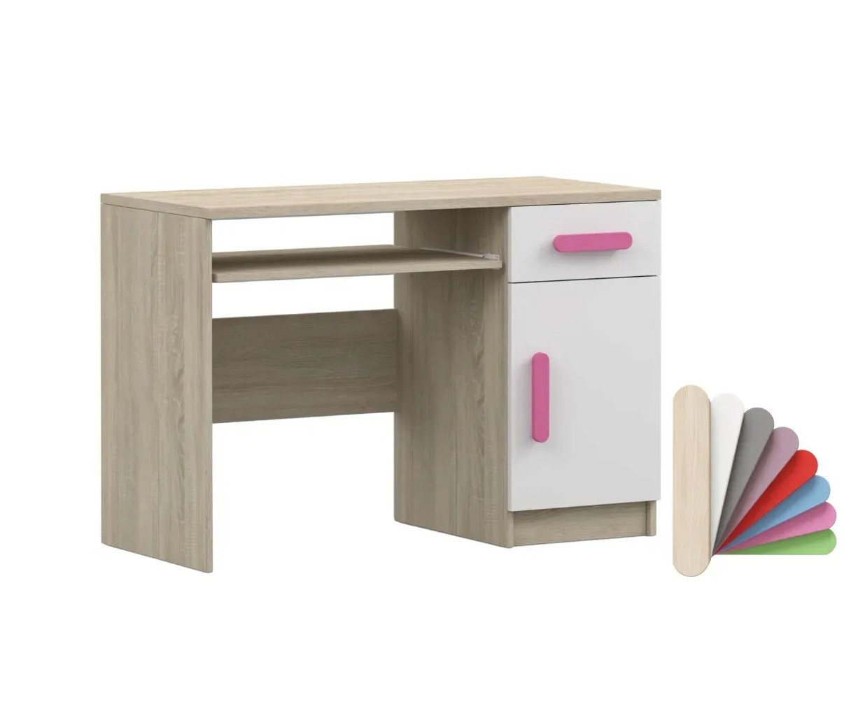 Pro studenty i kancelářské prostředí je psací stůl SMYK ideální volbou. Nabízí velkou pracovní plochu, na které najdete dostatek místa pro práci i studium. Zásuvka pod pracovní deskou umožňuje uložení klávesnice počítače a šuplík na příslušenství usnadní organizaci pracovního prostoru. Praktická skříňka s policí je umístěna pod šuplíkem. Barevné úchytky z PVC přidávají zajímavý designový prvek k tomuto praktickému kusu nábytku.