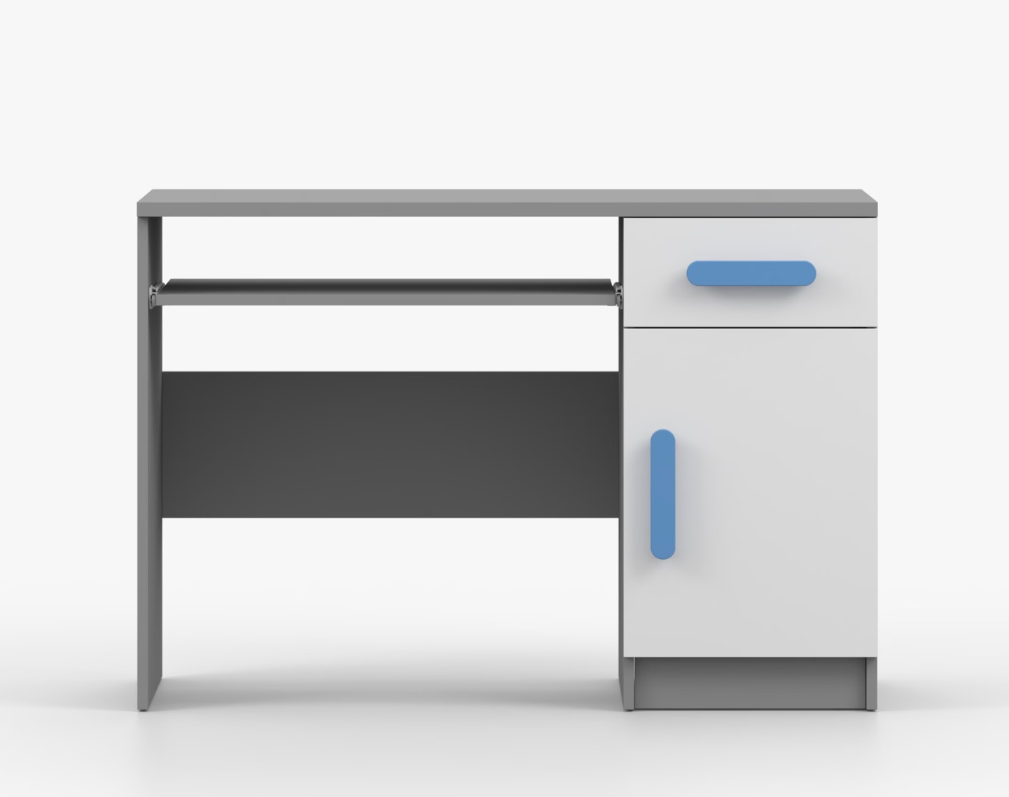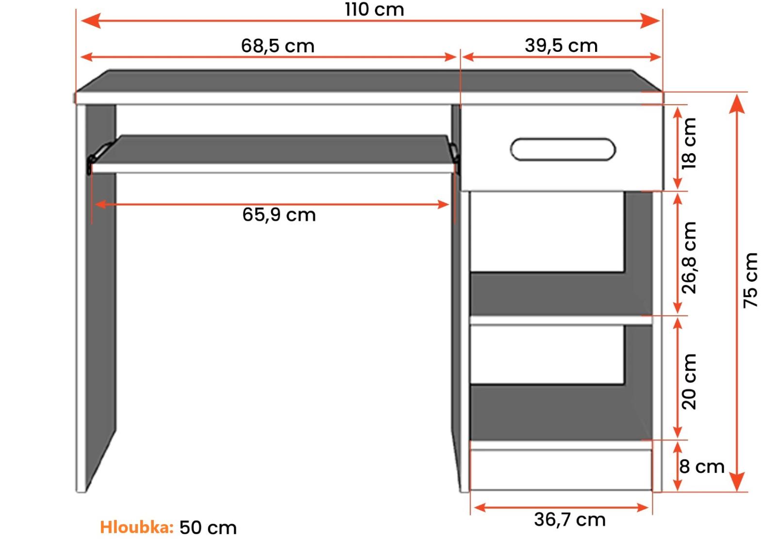 Pro studenty i kancelářské prostředí je psací stůl SMYK ideální volbou. Nabízí velkou pracovní plochu, na které najdete dostatek místa pro práci i studium. Zásuvka pod pracovní deskou umožňuje uložení klávesnice počítače a šuplík na příslušenství usnadní organizaci pracovního prostoru. Praktická skříňka s policí je umístěna pod šuplíkem. Barevné úchytky z PVC přidávají zajímavý designový prvek k tomuto praktickému kusu nábytku.