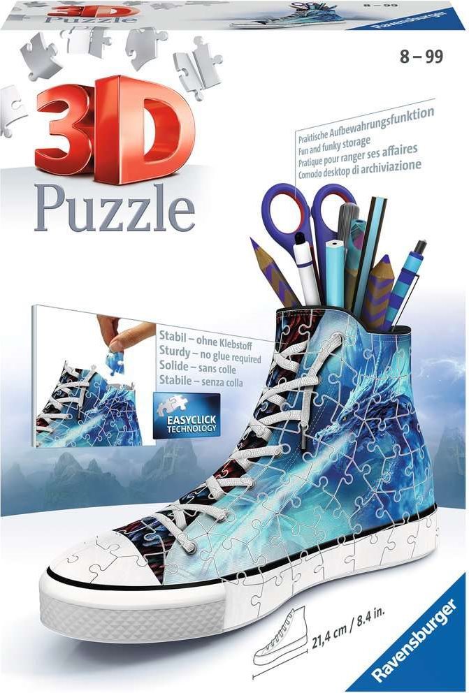 Geniální spojení pro milovníky tenisek a skládání! Poskládejte si 3D puzzle neotřelého tvaru, které oživí Váš stůl ... RAVENSBURGER se pustil do produkce 3D tenisek, které lze použít třeba jako originální tužkovníky pro pera, pastelky nebo třeba štětce. Speciální zakřivené nebo ohebné dílky, které přesně zapadnou na své místo, umožňují postavit designovou tenisku s vesmírným potiskem. Dílky jsou vyrobeny z pevného plastu a zaručí vynikající stabilitu. Kecka drží bez nutnosti lepení. Balení obsahuje 108 očíslovaných dílků puzzle, 4 dílů příslušenství a návod. Dekorace není součástí balení.