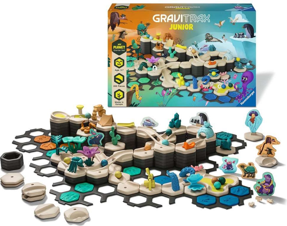 GraviTrax Junior je interaktivní systém kuličkové dráhy pro děti od 3 let. Ti nejmenší si staví své vlastní světy z kuličkových drah, které lze podle libosti zdobit a vytvářet tak jednotlivé tématické světy. Děti si tak při kreativním stavění užijí mnoho zábavy. GraviTrax Junior Startovní sada Můj svět obsahuje vše, co potřebujete, abyste mohli ihned začít stavět a ponořit se do světů džungle, ledu, pouště a oceánu. S různými prvky a figurkami zvířat mohou děti zažít zblízka 4 tematické světy, které si mohou při hře vyzdobit. Tato XXL tématická startovní sada nabízí neomezenou zábavu pro všechny malé fanoušky GraviTraxu.