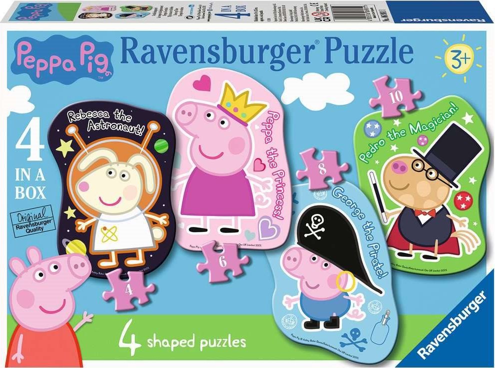 Čtyři velké tvarované puzzle pro děti s různou obtížností od 4 do 10 dílků s hrdiny z animovaného seriálu Prasátko Peppa . Dětské konturové puzzle - složené puzzle nemá tradiční tvar obdélníku, nýbrž kopíruje vyobrazený motiv. Německé RAVENSBURGER puzzle drží přední příčku v oblíbenosti i prodejnosti mezi světovými výrobci puzzle. Každý dílek je v prvotřídní kvalitě a dílky přesně zapadají do sebe. Díky použití impregnovaného lnu je obrázek puzzle bez reflexů. Puzzle Ravensburger má ohebné a stabilní dílky a je vyrobeno z recyklované lepenky.Vlastnosti