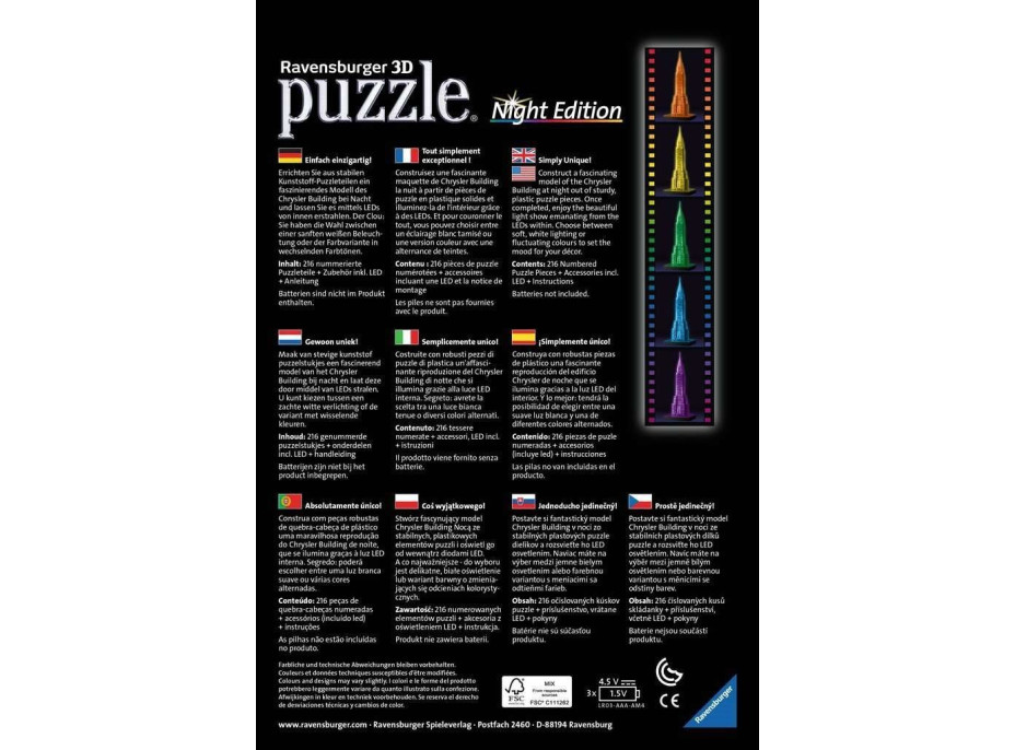 New York je město, které nikdy nespí! Nyní můžete mít kousek jeho záře i ve svém pokoji. Jedinečná barevně svítící stavba od mistra ve výrobě puzzle RAVENSBURGER, která se díky LED světlu ve tmě rozzáří, a navíc mění barvy - to je něco, co Vás doopravdy uchvátí. Noční Chrysler Building je skvělým dárkem i nevšedním kouskem v 3D rozměru. Speciální ohebné dílky, které díky technologii EASYCLICK přesně zapadnou na své místo, umožňují postavit fascinující model slavné budovy Chrysler Building. Dílky vyrobeny z pevného plastu zaručí vynikající stabilitu, a celá stavba drží bez nutnosti lepení. Díky originálním doplňkovým dílkům budou vaši stavbu všichni obdivovat. Balení obsahuje: 216 očíslovaných dílků puzzle, 10 dílů příslušenství, světelný modul včetně LED a návod. Baterie 3x AAA nejsou součástí výrobku. Ilustrační video Chrysler Building je mrakodrap v New Yorku, jednom z nejvýznamnějších měst Spojených států amerických. Nachází se na Manhattanu (Midtown Manhattan) a patří mezi jedny z nejznámějších symbolů města, hlavně díky svojí charakteristické špičce. Jako první mrakodrap na světě překročil výšku Eiffelovy věže (300 m) a pokořil magickou hranici 1000 stop (305 m), vyrostl až do výšky 318 m, dokončen byl roku 1930. Více na Wikipedii Rozměr složeného puzzle cca 18 x 18 x 47,5 cmVlastnosti