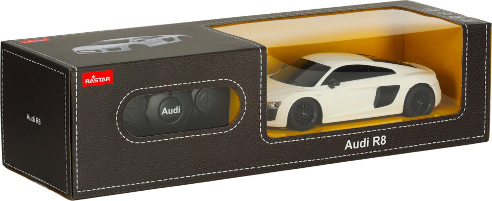 Dálkově ovládané auto Rastar 72300 v měřítku 1:24 je věrnou replikou vozu Audi R8 z roku 2015 v bílé barvě. Detaily, jako je logo značky, aerodynamická silueta a výrazné linie karoserie, dodávají modelu realistický vzhled.
