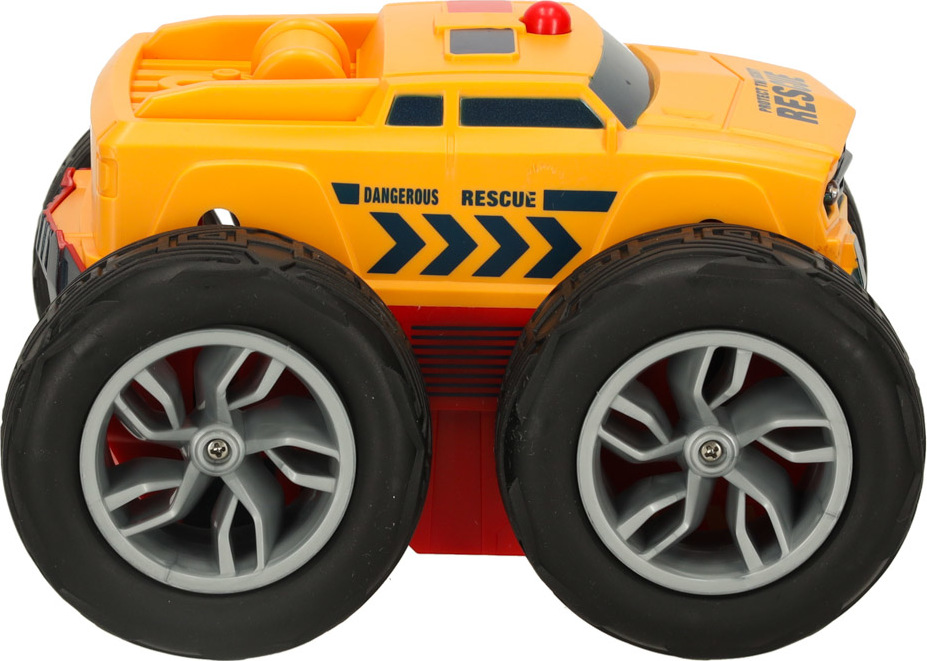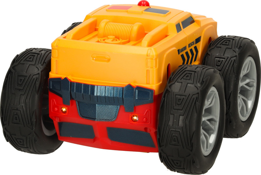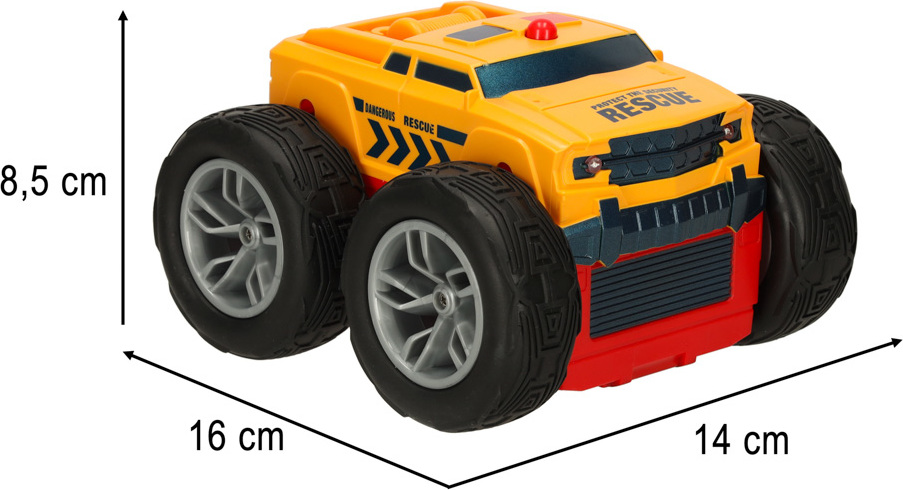 Revolt Rescue Racer není jedno, ale dvě auta v jednom! Jediným tlačítkem se auto promění z hasičského vozu na záchranné vozidlo. Velké gumové pneumatiky (průměr 7,5 cm) snadno překonají jakoukoli překážku. Unikátní design s kolečky, která se pohybují nahoru a dolů, vám umožní pokračovat v jízdě, i když se auto převrátí. Ovládejte auto ze vzdálenosti 15-20 metrů pomocí intuitivního ovladače napájeného 2 bateriemi AAA (nejsou součástí balení). Ovládání na frekvenci 2,4 GHz zajišťuje stabilní připojení bez rušení signálu. Doba přehrávání na plné nabití je až 25 minut a baterii 3,7 V 900 mAh (součástí balení) lze nabít za 150 minut pomocí přiloženého USB kabelu.