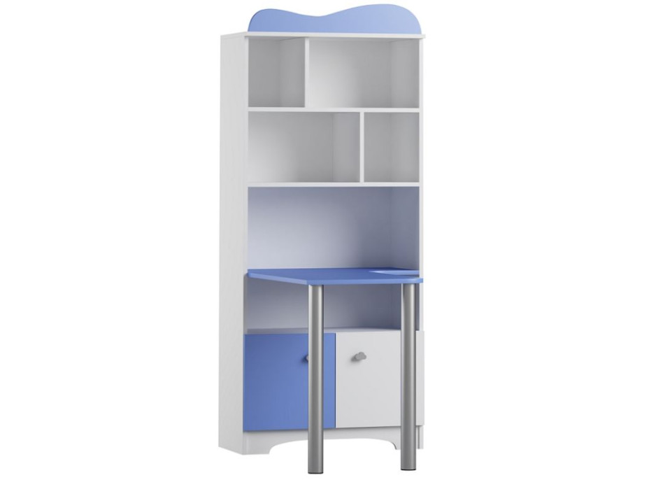 Praktický úložný regál CLOUDS se zabudovaným psacím stolem je vyrobený z kvalitních lamino desek o síle 18 mm v bílé barvě kombinované s barevnými dvířky a detaily v barvě dle vašeho výběru. Hrany nábytku jsou zakončeny ABS/PVC materiálem, který jej chrání před mechanickým poškozením a vlhkostí. Regál obsahuje otevřené police kombinované s uzavřenými skříňkami. Čela dvířek jsou osazena plastovými úchyty ve tvaru mráčků, charakteristickými pro celou kolekci. Úchyty dodávají nábytku jedinečný charakter a styl. Regál je doplněn o praktický psací stůl. Orientaci nábytku lze zvolit na pravou nebo levou stranu. Psací stůl má chromované nohy s možností regulace výšky o 1,5 cm. Kombinujte nábytek z kolekce CLOUDS přesně na míru velikosti pokoje i potřebám svých dětí.