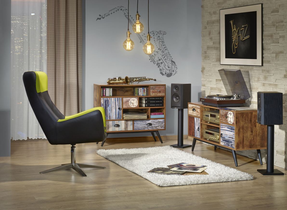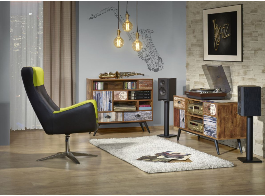 Moderní víceúčelový regál Maze nabízí mnohostranné využití. Kovové nohy nejsou jen povedeným detailem, ale také splňují praktické požadavky pro snadný úklid. Regál je vyrobený z fóliované dřevotřísky a jeho neotřelý dekor ozdobí vaši domácnost. Kombinace polic a šuplíků udělá z regálu také praktickou součást interiéru. Skládá se ze čtyř zásuvek, jedné police a dvou otevřených přihrádek. Nábytek Maze potěší milovníky moderních a stylových interiérů. Dveře a zásuvky se otevírají pomocí originálních úchytek různých tvarů a barev.