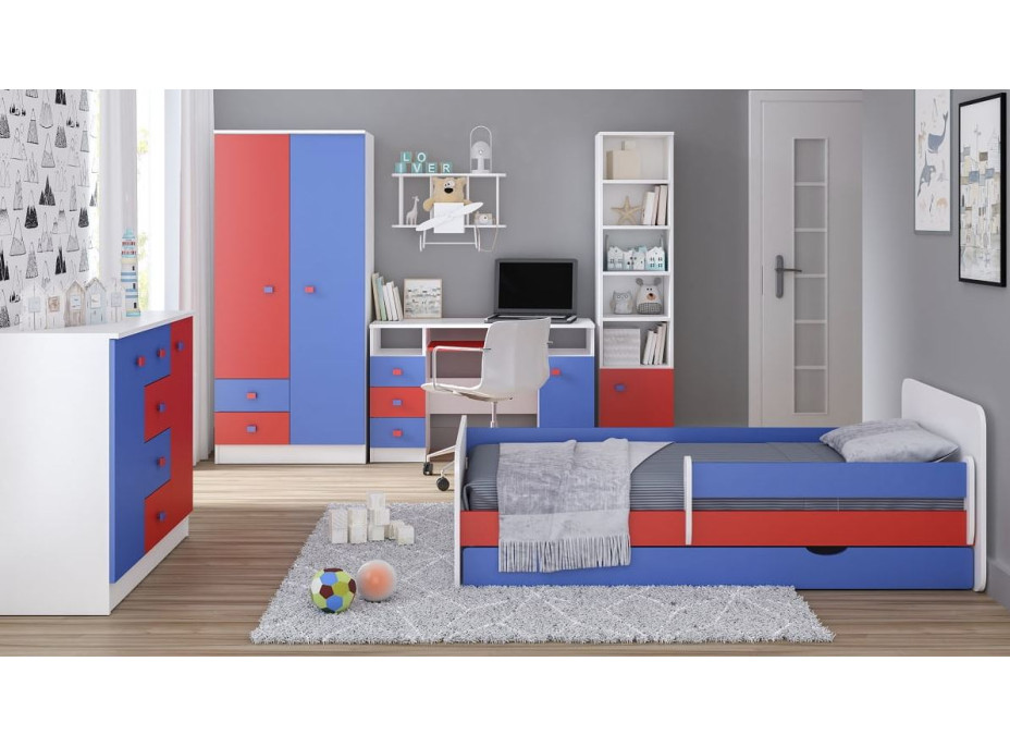 Praktický úložný regál MODE, který skvěle poslouží jako knihovna, je vyrobený z kvalitních lamino desek o síle 18 mm v bílé barvě kombinované s červenými a modrými dvířky. Hrany nábytku jsou zakončeny ABS/PVC, které jej chrání před mechanickým poškozením a vlhkostí. Regál obsahuje otevřené police a dvě uzavřené skříňky ve spodní části. Čela dvířek jsou osazena plastovými úchyty, charakteristickými pro celou kolekci. Úchyty dokonale ladí s barevnou přední stranou a dodávají nábytku jedinečný charakter a styl. Kombinujte nábytek z kolekce MODE přesně na míru velikosti pokoje i potřebám svých dětí.