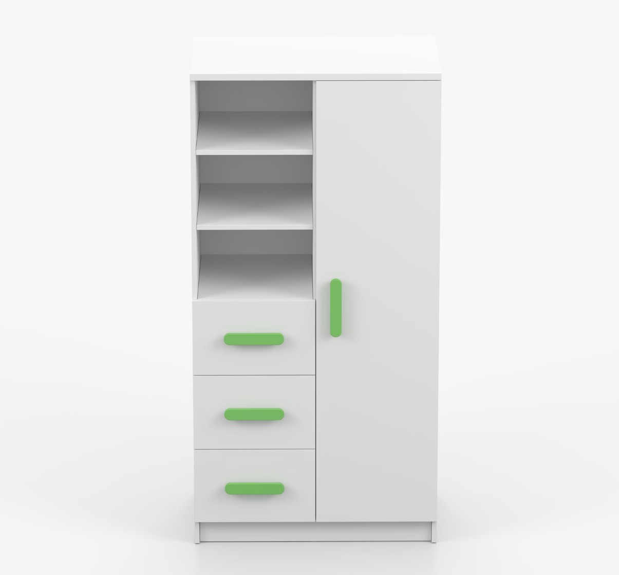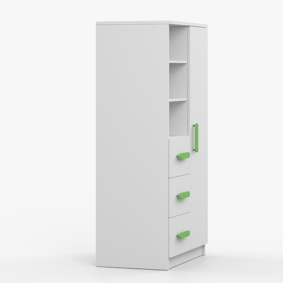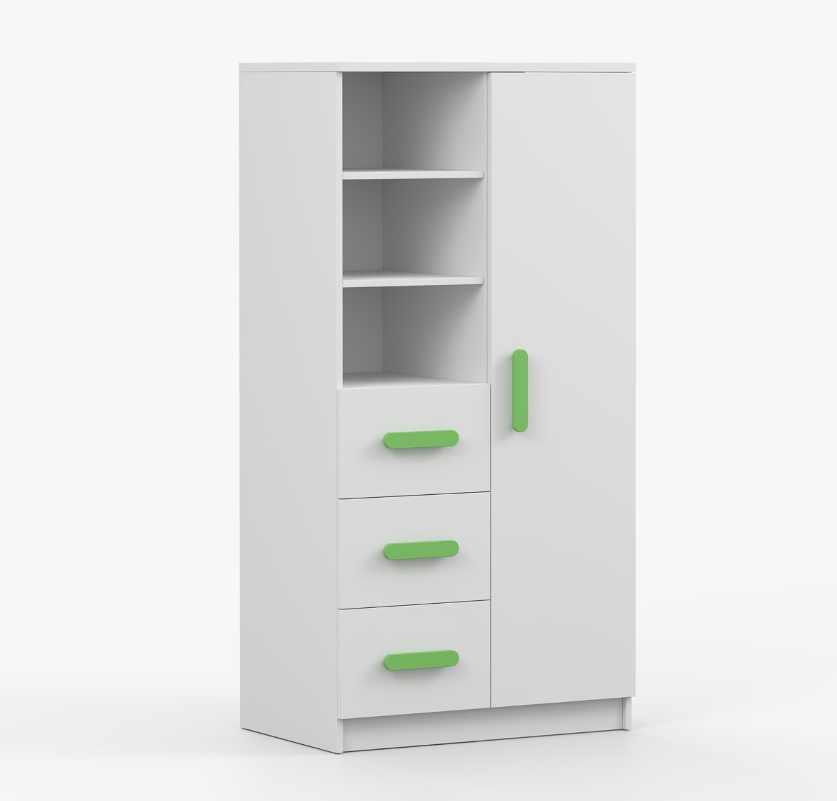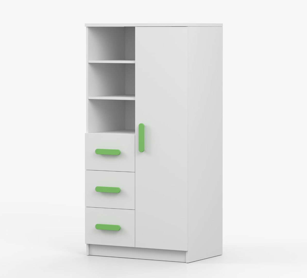Regál SCOUT nabízí praktické a všestranné úložné řešení pro každou domácnost. Je složen z dvou polic, tří prostorných zásuvek a boční skříňky s vnitřními policemi, což umožňuje dostatek prostoru pro uložení knih, oblečení a dalších věcí. Regál je vyroben z kvalitní laminované desky o tloušťce 16 mm s odolnou ABS lištou, chránící hrany regálu před mechanickým poškozením. Barevné úchytky z PVC dodávají tomuto praktickému kusu nábytku zajímavý designový prvek.