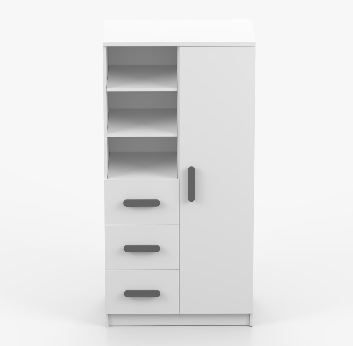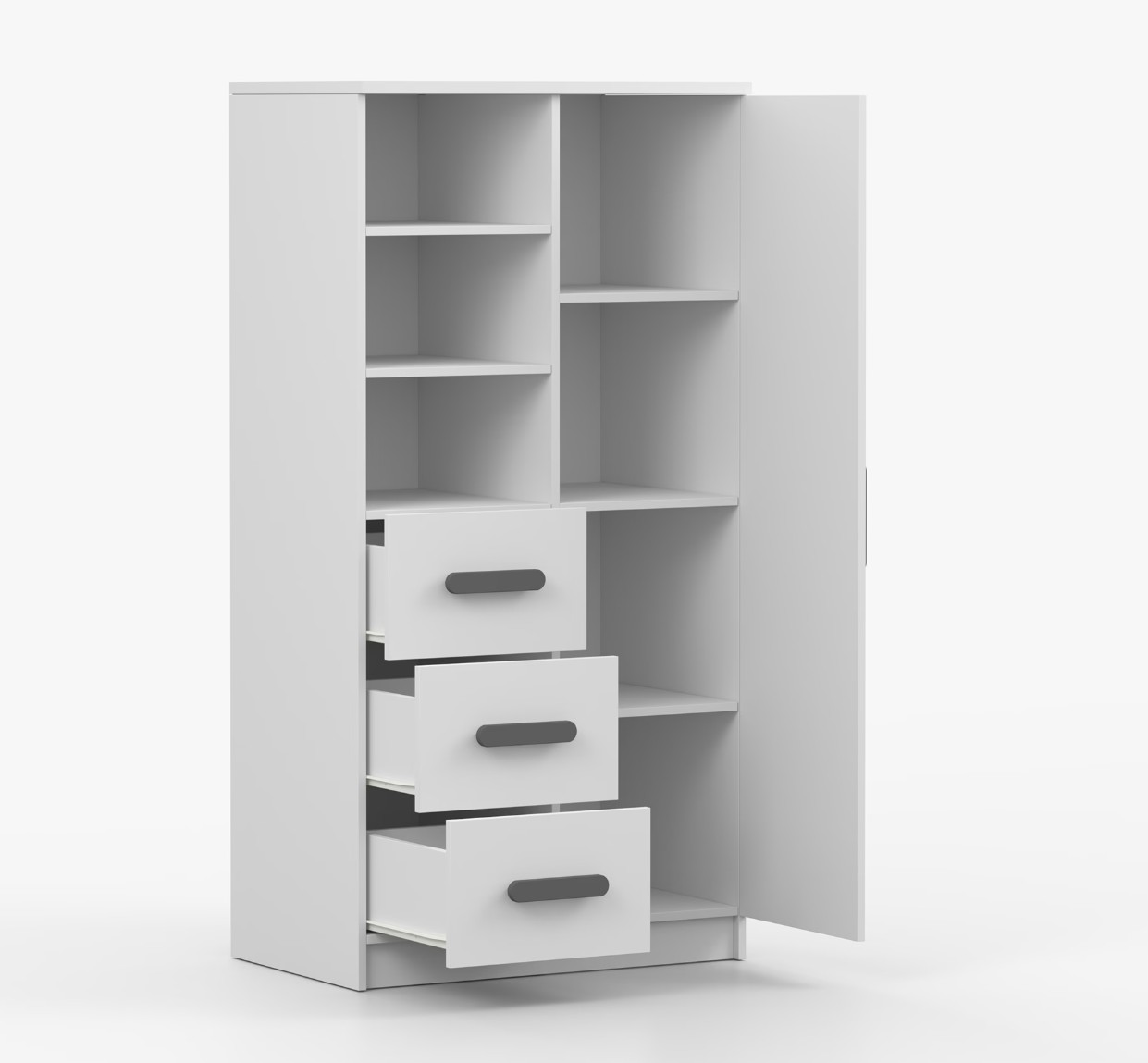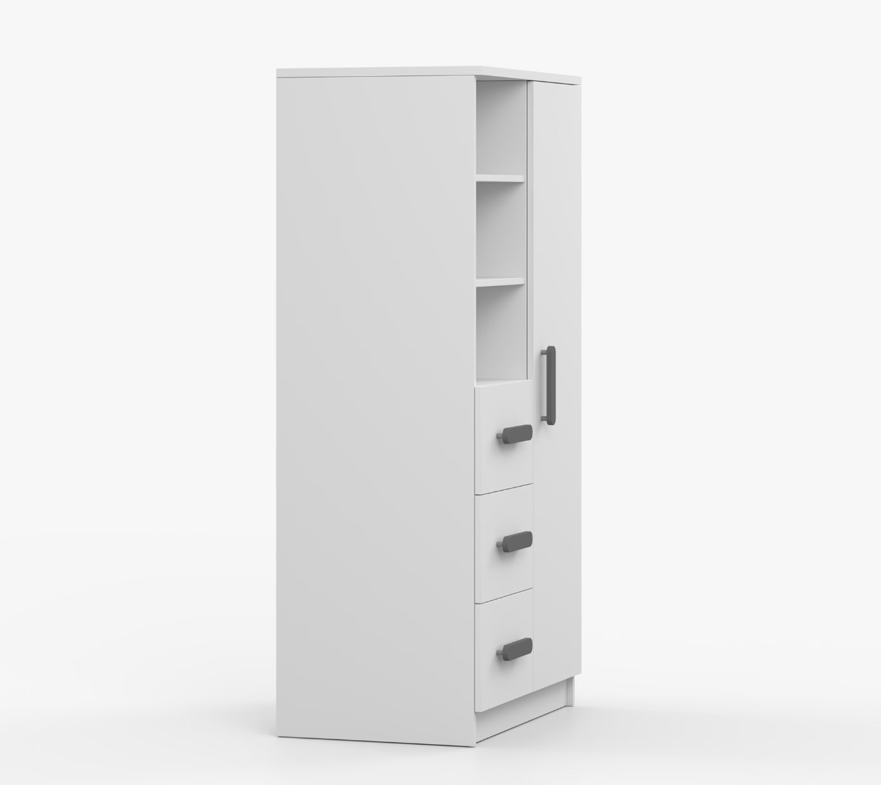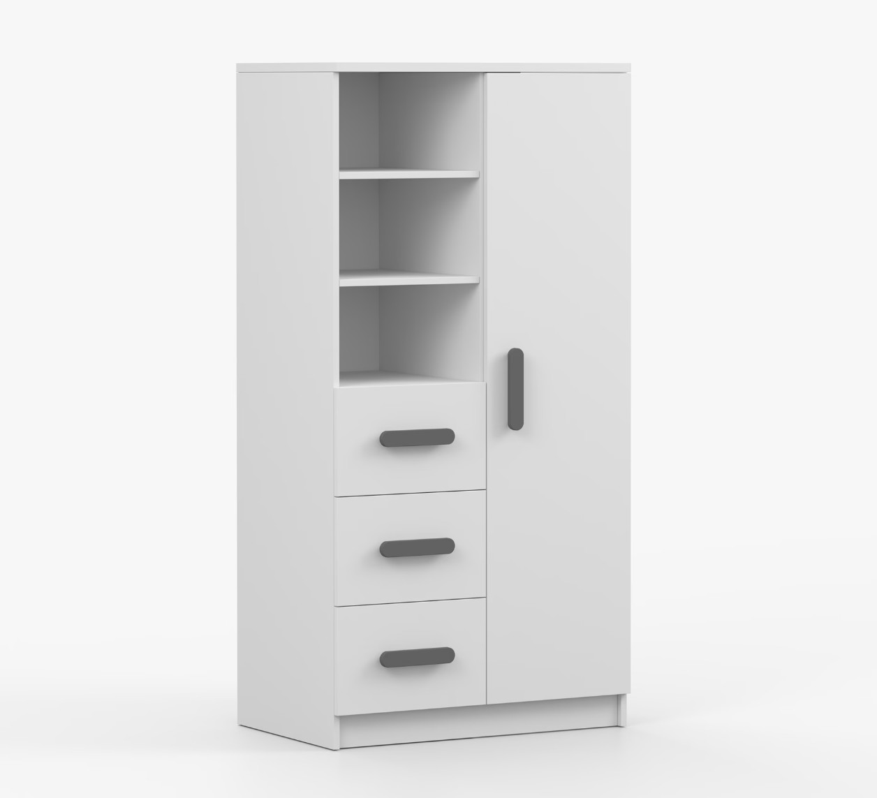 Regál SCOUT nabízí praktické a všestranné úložné řešení pro každou domácnost. Je složen z dvou polic, tří prostorných zásuvek a boční skříňky s vnitřními policemi, což umožňuje dostatek prostoru pro uložení knih, oblečení a dalších věcí. Regál je vyroben z kvalitní laminované desky o tloušťce 16 mm s odolnou ABS lištou, chránící hrany regálu před mechanickým poškozením. Barevné úchytky z PVC dodávají tomuto praktickému kusu nábytku zajímavý designový prvek.