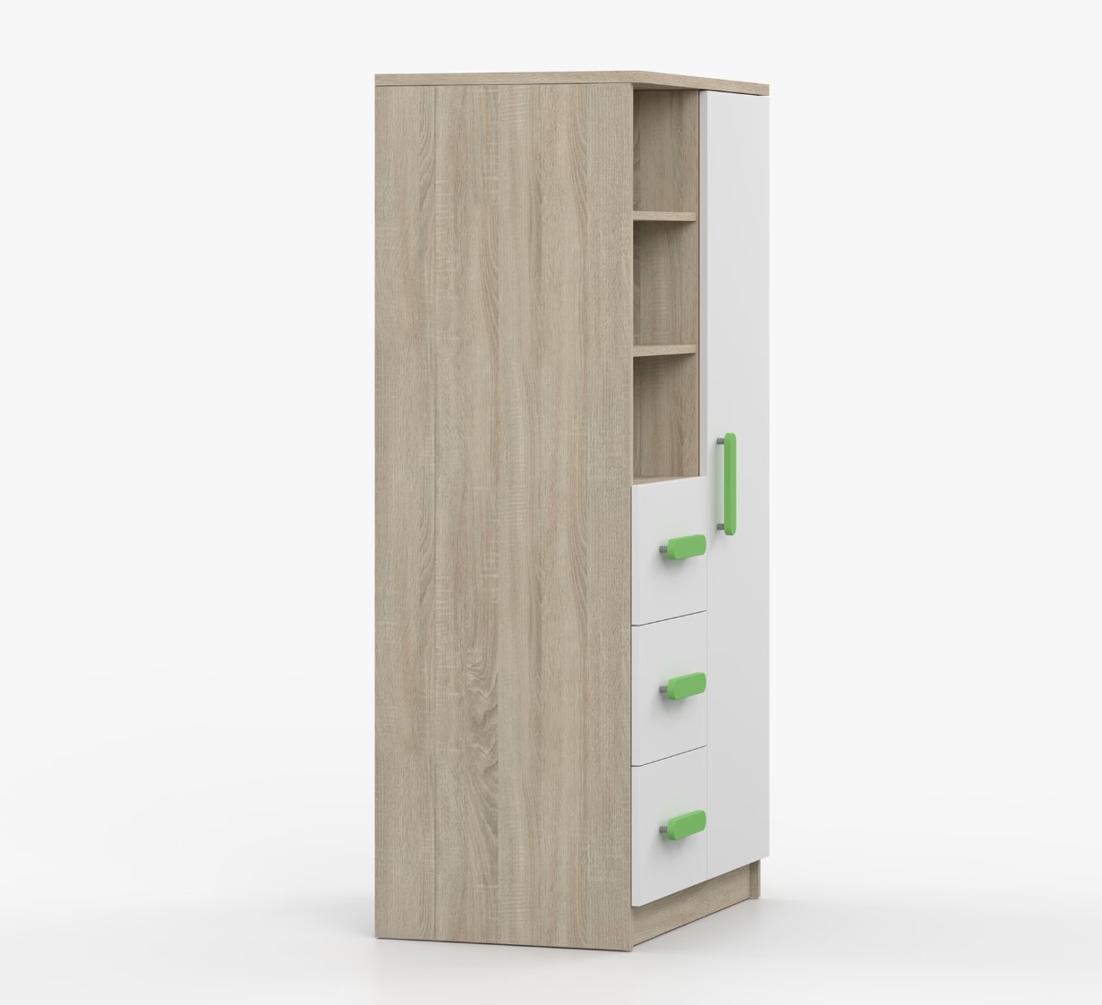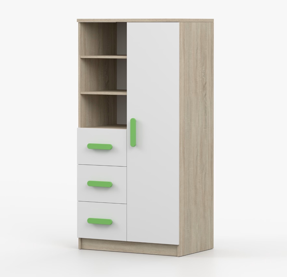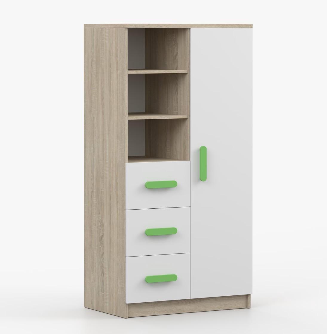 Regál SCOUT nabízí praktické a všestranné úložné řešení pro každou domácnost. Je složen z dvou polic, tří prostorných zásuvek a boční skříňky s vnitřními policemi, což umožňuje dostatek prostoru pro uložení knih, oblečení a dalších věcí. Regál je vyroben z kvalitní laminované desky o tloušťce 16 mm s odolnou ABS lištou, chránící hrany regálu před mechanickým poškozením. Barevné úchytky z PVC dodávají tomuto praktickému kusu nábytku zajímavý designový prvek.
