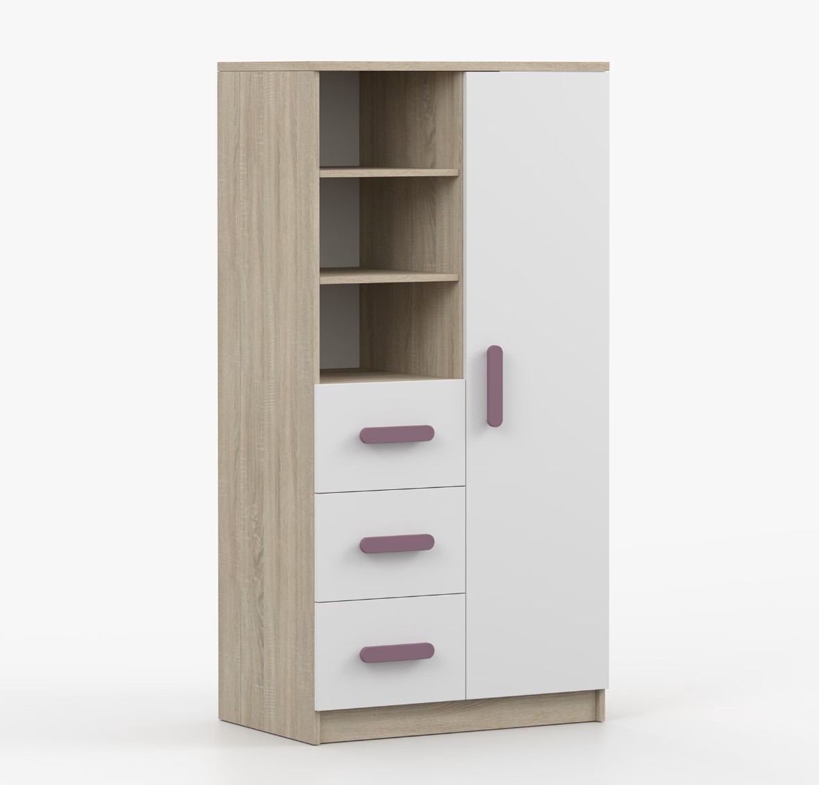 Regál SCOUT nabízí praktické a všestranné úložné řešení pro každou domácnost. Je složen z dvou polic, tří prostorných zásuvek a boční skříňky s vnitřními policemi, což umožňuje dostatek prostoru pro uložení knih, oblečení a dalších věcí. Regál je vyroben z kvalitní laminované desky o tloušťce 16 mm s odolnou ABS lištou, chránící hrany regálu před mechanickým poškozením. Barevné úchytky z PVC dodávají tomuto praktickému kusu nábytku zajímavý designový prvek.