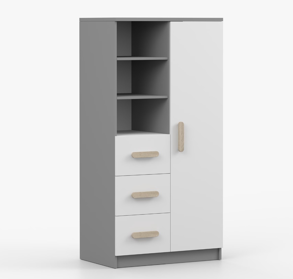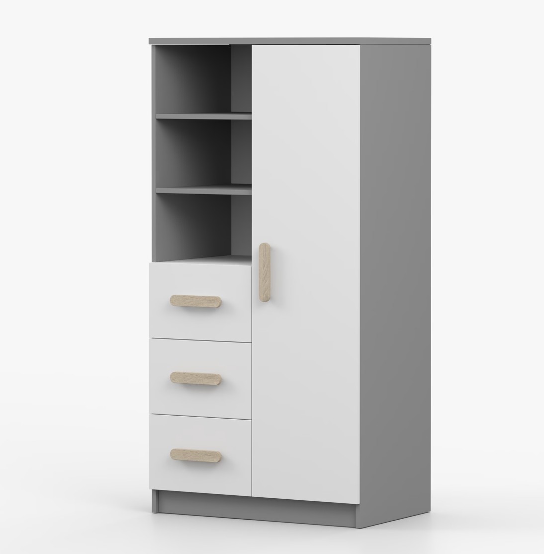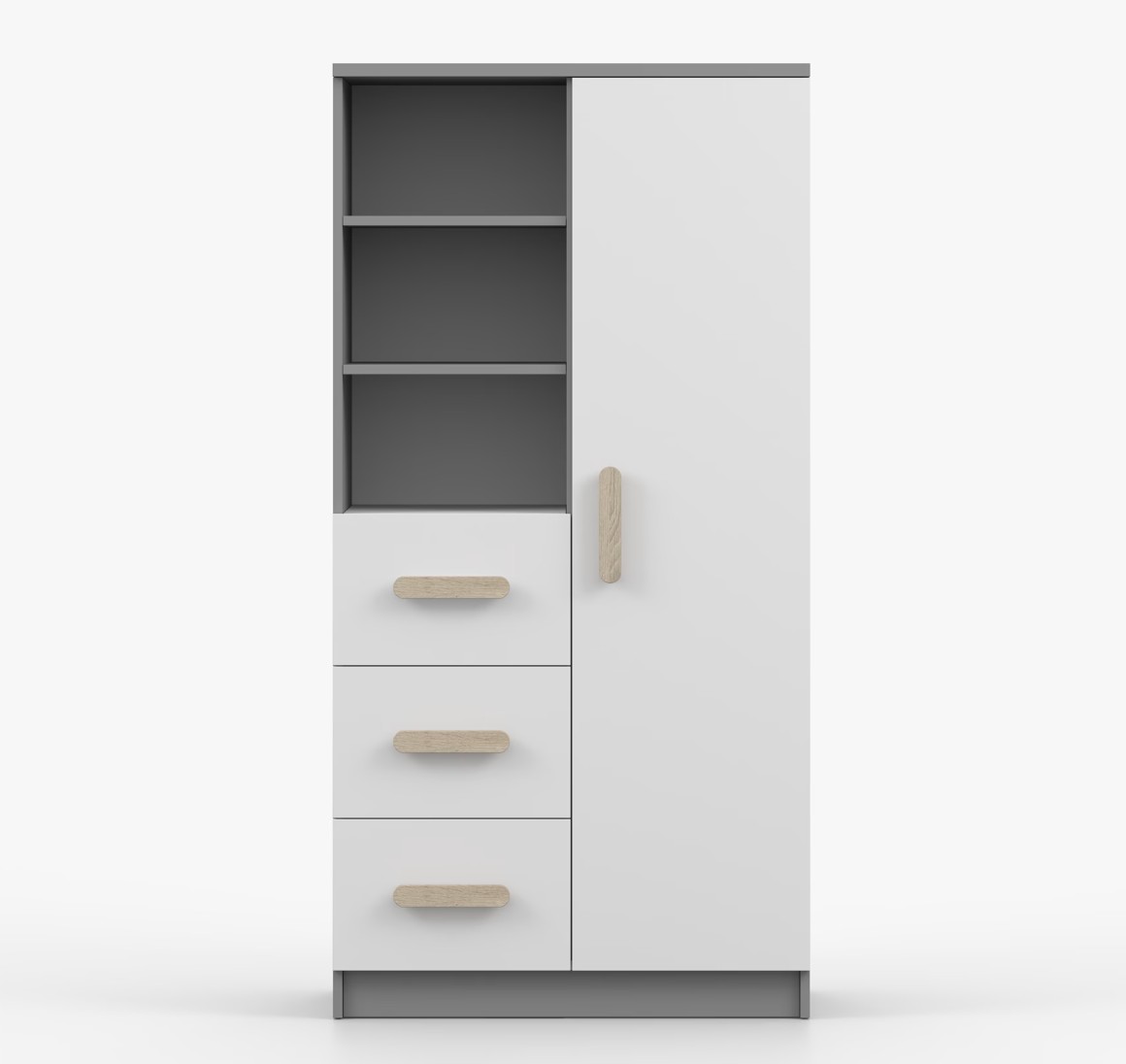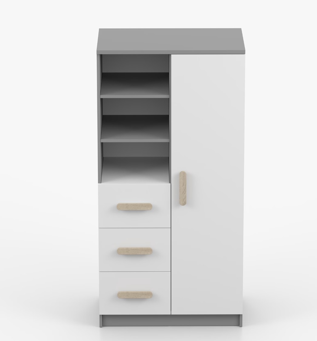 Regál SCOUT nabízí praktické a všestranné úložné řešení pro každou domácnost. Je složen z dvou polic, tří prostorných zásuvek a boční skříňky s vnitřními policemi, což umožňuje dostatek prostoru pro uložení knih, oblečení a dalších věcí. Regál je vyroben z kvalitní laminované desky o tloušťce 16 mm s odolnou ABS lištou, chránící hrany regálu před mechanickým poškozením. Barevné úchytky z PVC dodávají tomuto praktickému kusu nábytku zajímavý designový prvek.