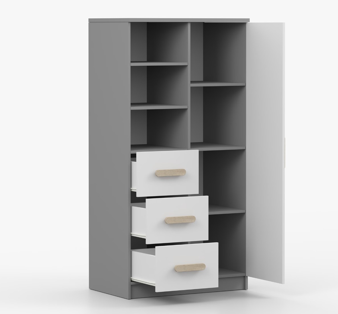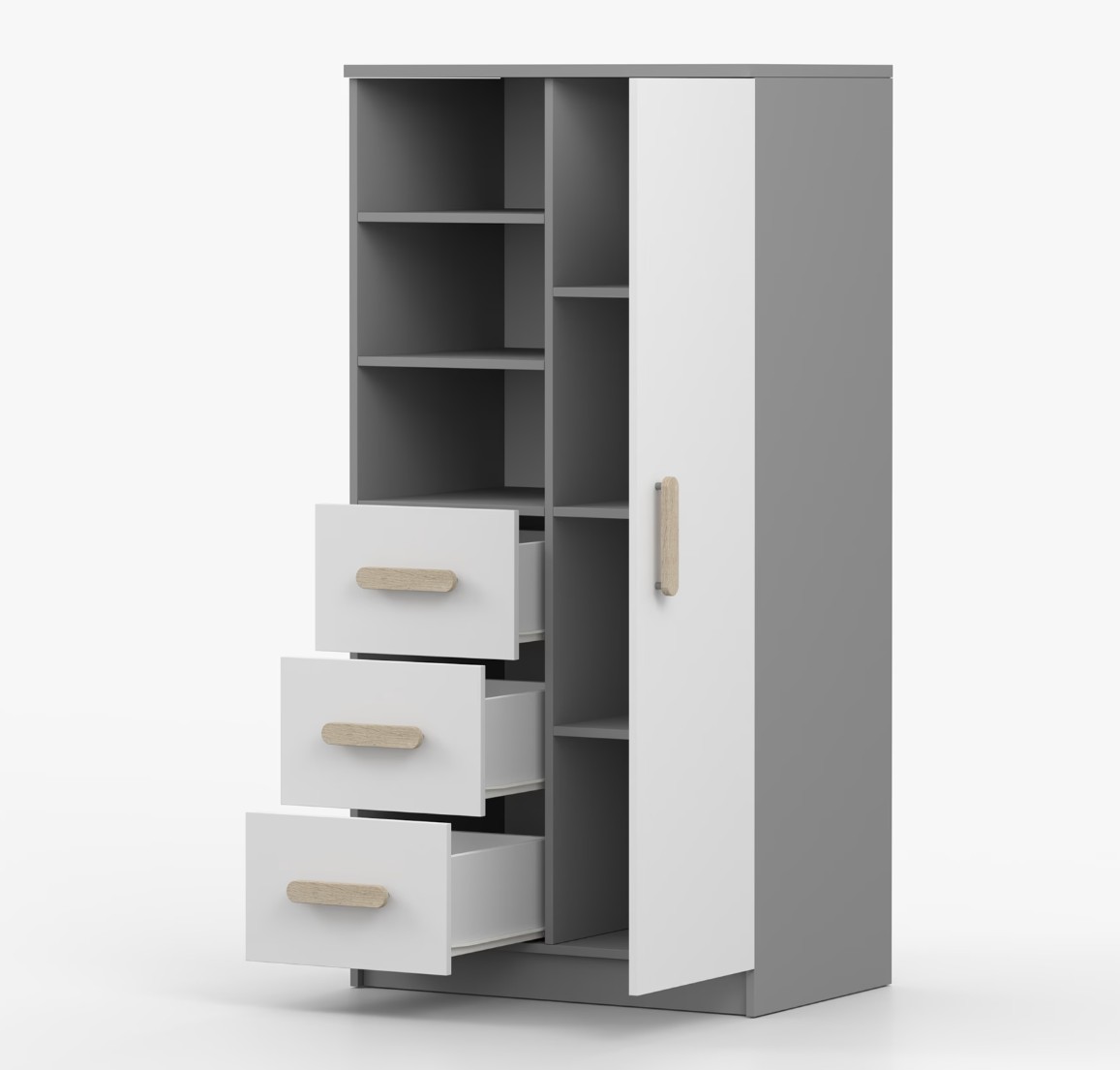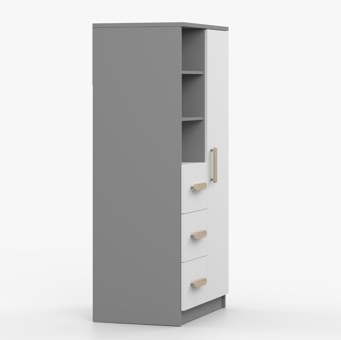 Regál SCOUT nabízí praktické a všestranné úložné řešení pro každou domácnost. Je složen z dvou polic, tří prostorných zásuvek a boční skříňky s vnitřními policemi, což umožňuje dostatek prostoru pro uložení knih, oblečení a dalších věcí. Regál je vyroben z kvalitní laminované desky o tloušťce 16 mm s odolnou ABS lištou, chránící hrany regálu před mechanickým poškozením. Barevné úchytky z PVC dodávají tomuto praktickému kusu nábytku zajímavý designový prvek.