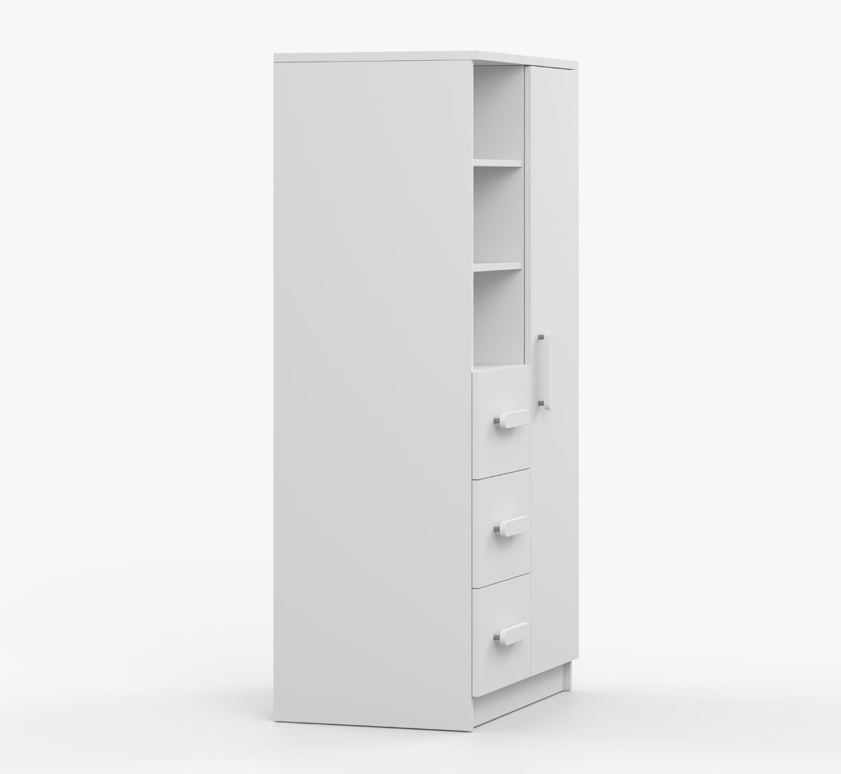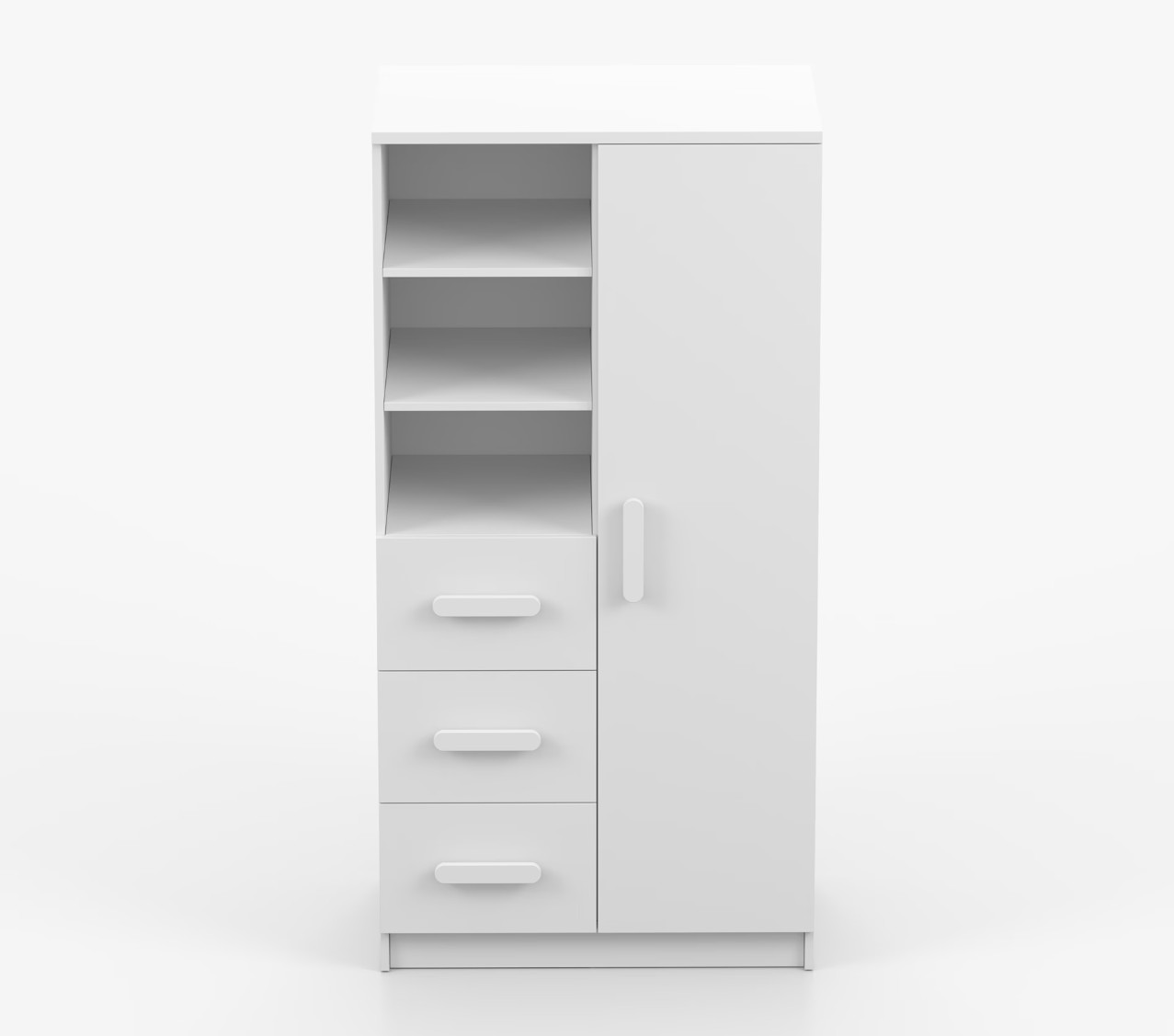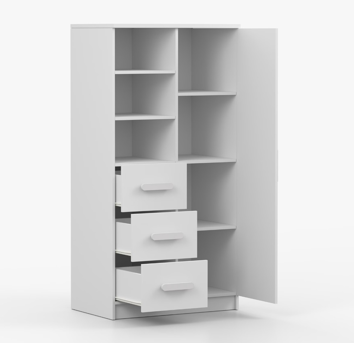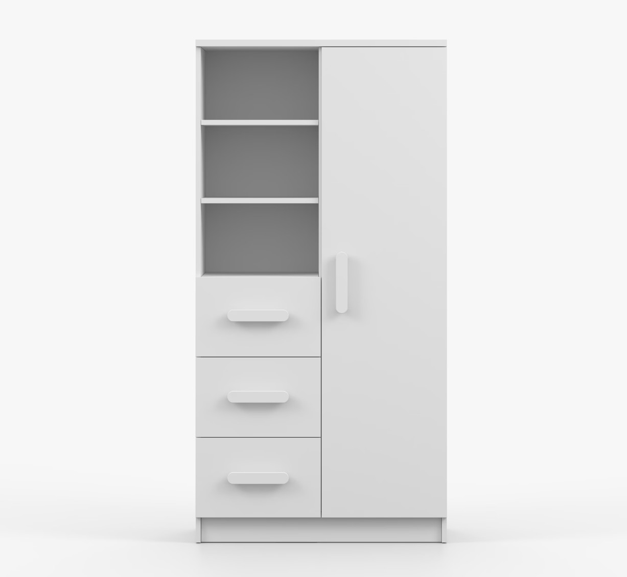 Regál SMYK nabízí praktické a všestranné úložné řešení pro každou domácnost. Je složen z dvou polic, tří prostorných zásuvek a boční skříňky s vnitřními policemi, což umožňuje dostatek prostoru pro uložení knih, oblečení a dalších věcí. Regál je vyroben z kvalitní laminované desky o tloušťce 16 mm s odolnou ABS lištou, chránící hrany regálu před mechanickým poškozením. Barevné úchytky z PVC dodávají tomuto praktickému kusu nábytku zajímavý designový prvek.
