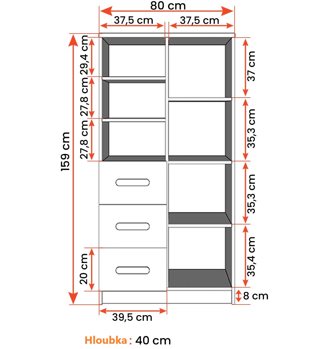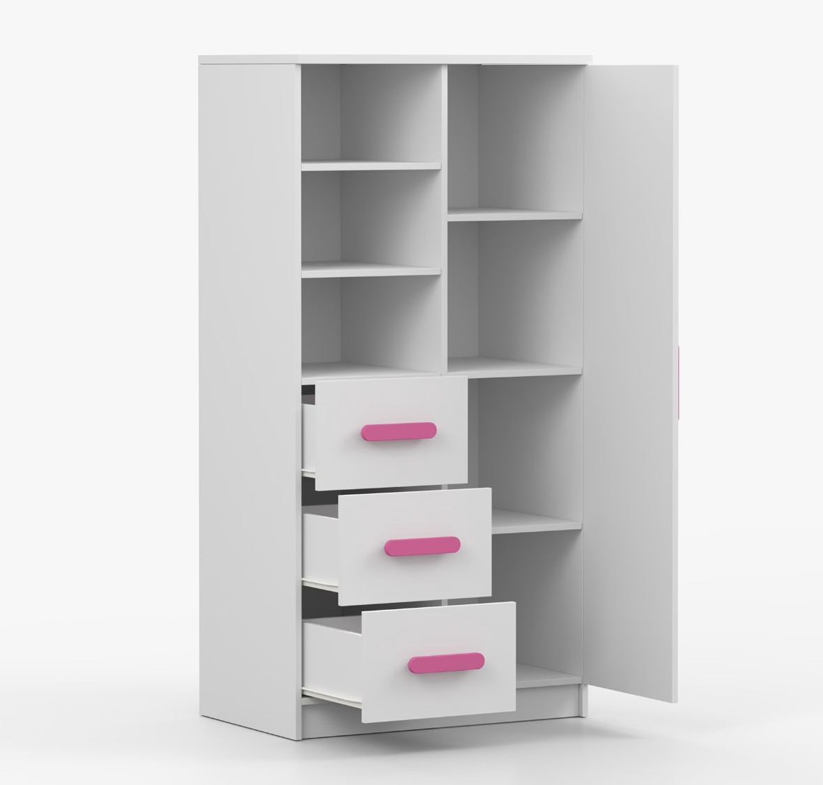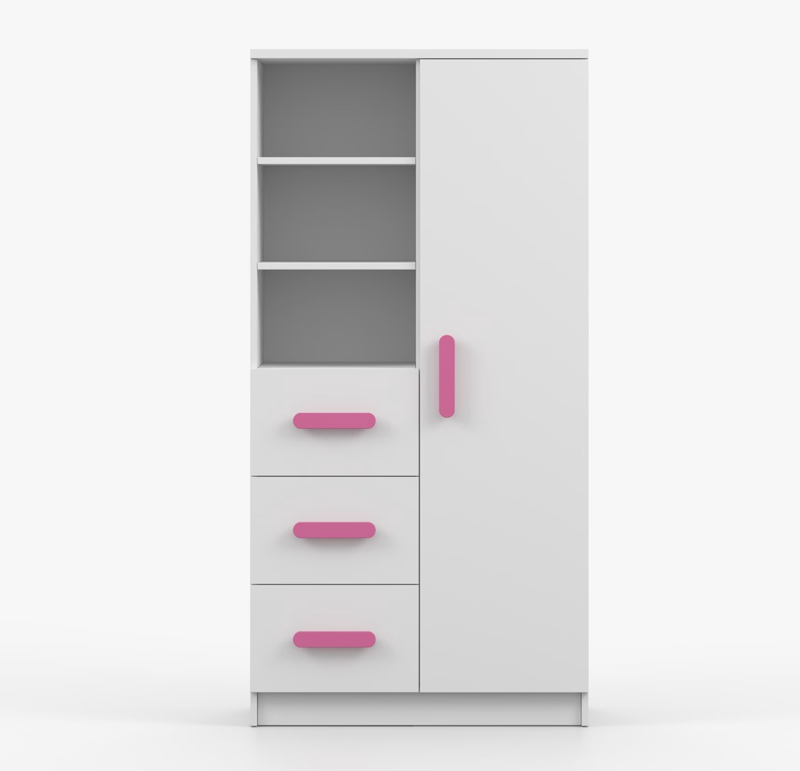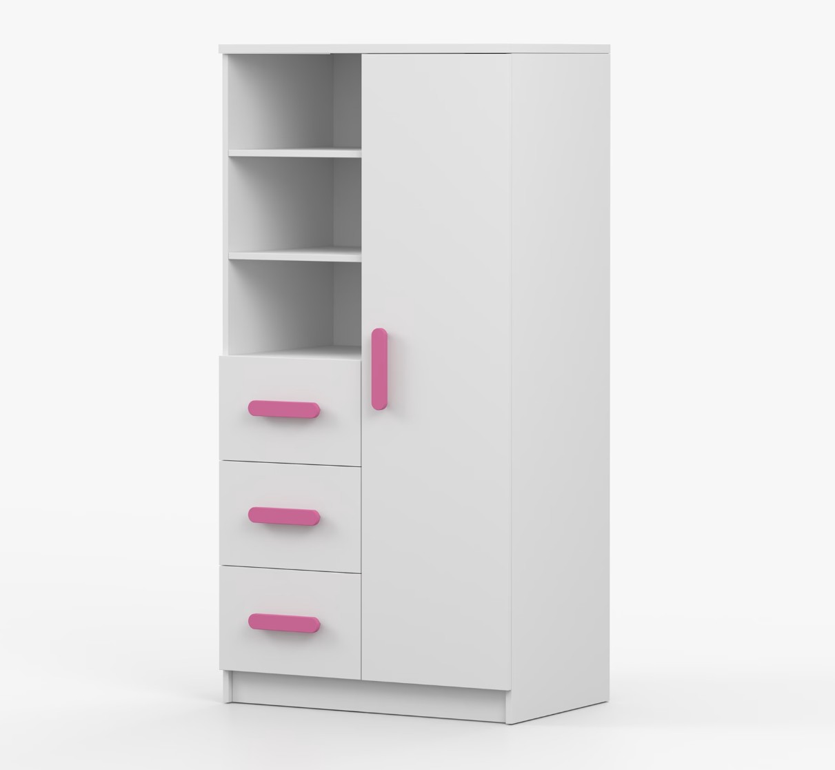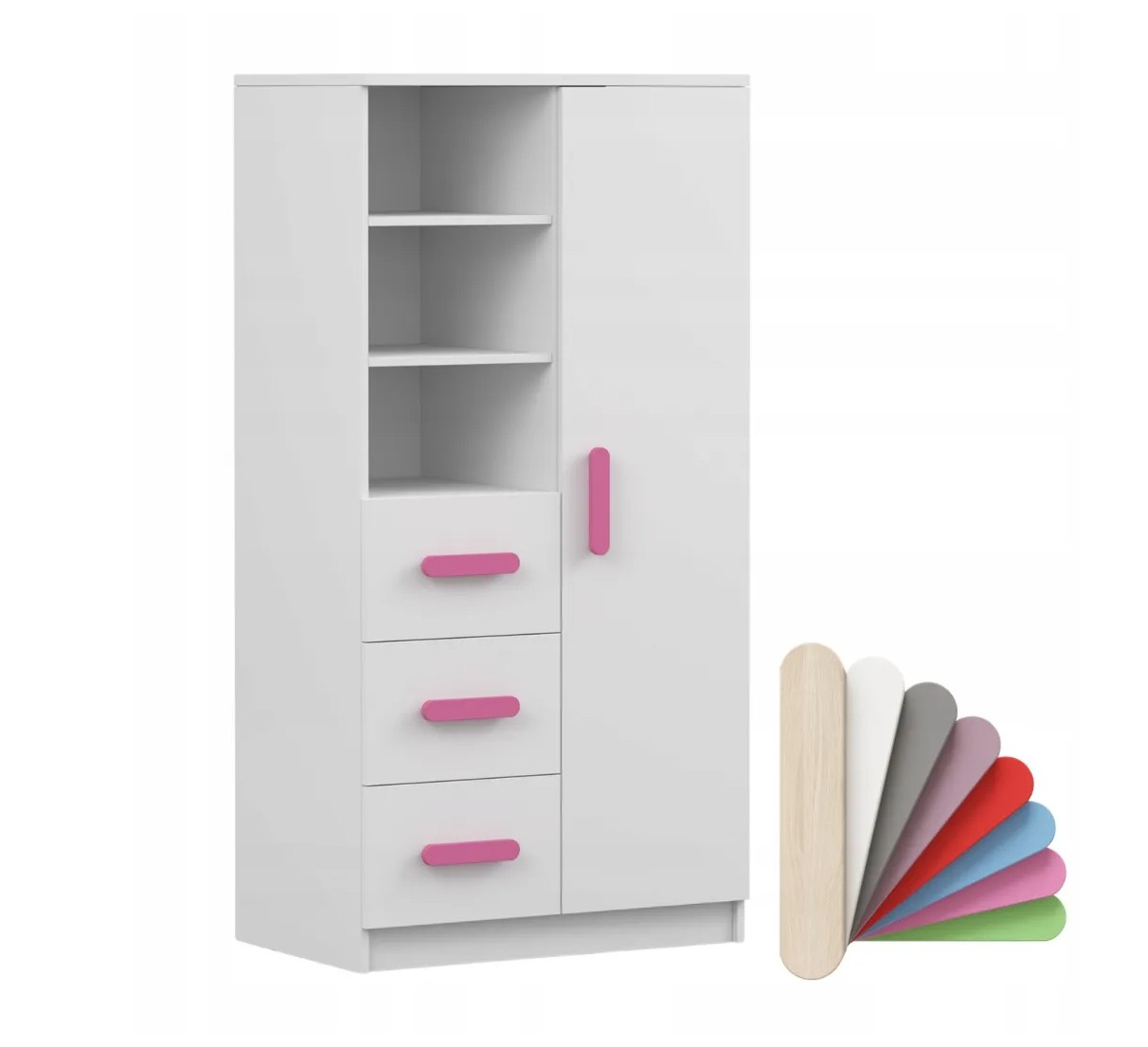Regál SMYK nabízí praktické a všestranné úložné řešení pro každou domácnost. Je složen z dvou polic, tří prostorných zásuvek a boční skříňky s vnitřními policemi, což umožňuje dostatek prostoru pro uložení knih, oblečení a dalších věcí. Regál je vyroben z kvalitní laminované desky o tloušťce 16 mm s odolnou ABS lištou, chránící hrany regálu před mechanickým poškozením. Barevné úchytky z PVC dodávají tomuto praktickému kusu nábytku zajímavý designový prvek.