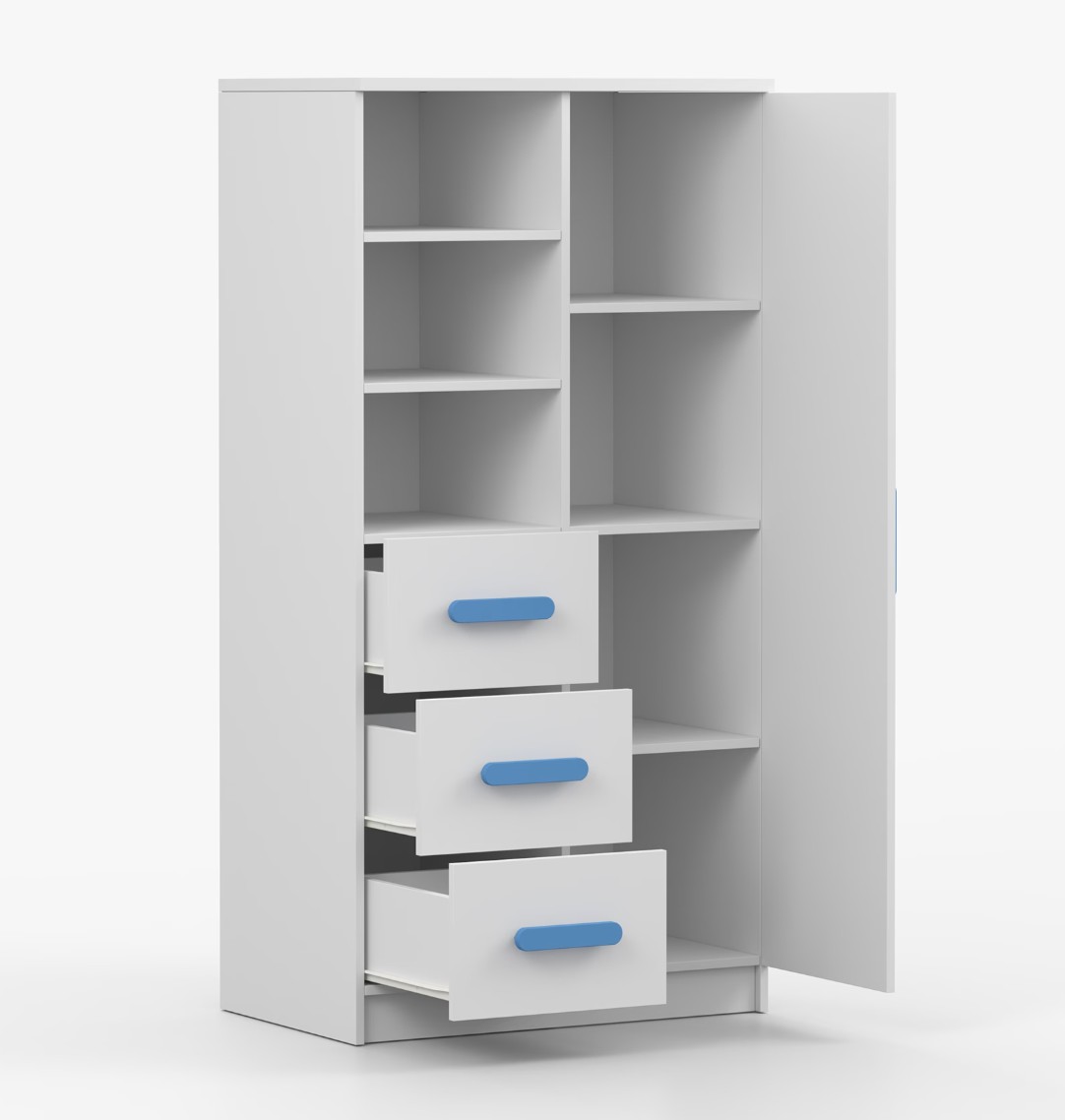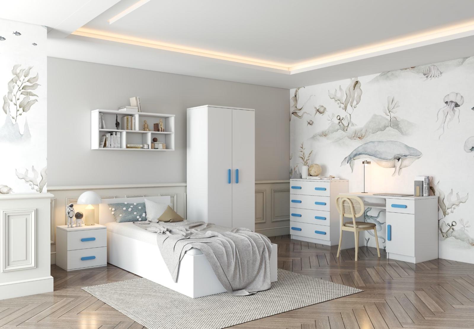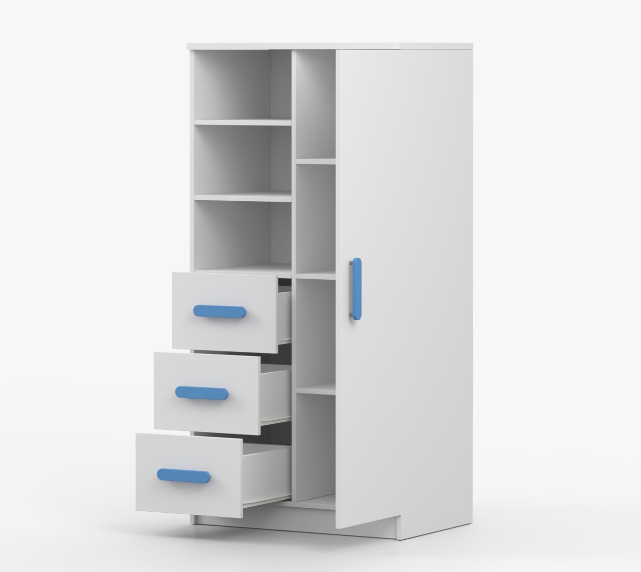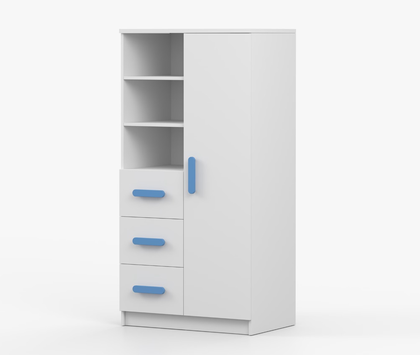 Regál SMYK nabízí praktické a všestranné úložné řešení pro každou domácnost. Je složen z dvou polic, tří prostorných zásuvek a boční skříňky s vnitřními policemi, což umožňuje dostatek prostoru pro uložení knih, oblečení a dalších věcí. Regál je vyroben z kvalitní laminované desky o tloušťce 16 mm s odolnou ABS lištou, chránící hrany regálu před mechanickým poškozením. Barevné úchytky z PVC dodávají tomuto praktickému kusu nábytku zajímavý designový prvek.