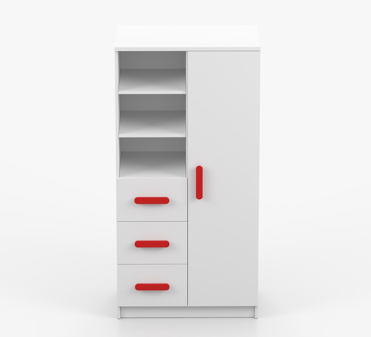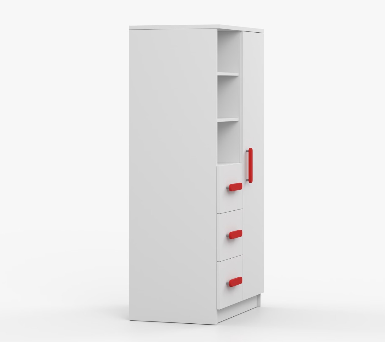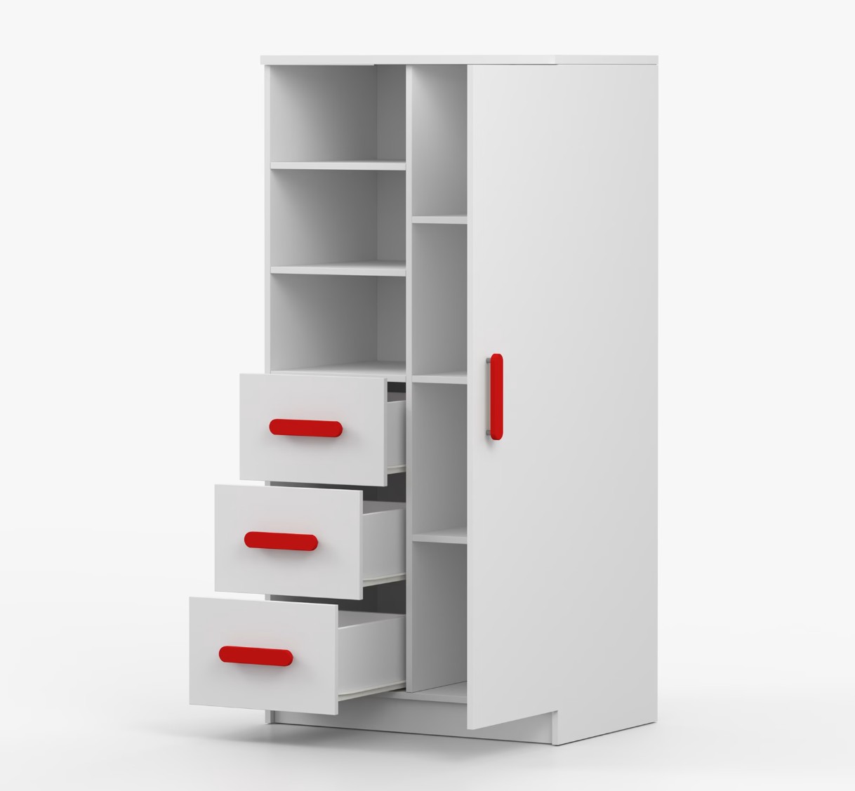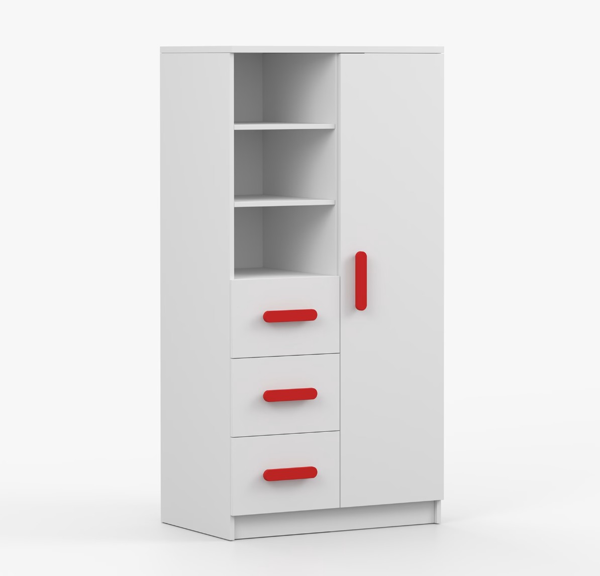 Regál SMYK nabízí praktické a všestranné úložné řešení pro každou domácnost. Je složen z dvou polic, tří prostorných zásuvek a boční skříňky s vnitřními policemi, což umožňuje dostatek prostoru pro uložení knih, oblečení a dalších věcí. Regál je vyroben z kvalitní laminované desky o tloušťce 16 mm s odolnou ABS lištou, chránící hrany regálu před mechanickým poškozením. Barevné úchytky z PVC dodávají tomuto praktickému kusu nábytku zajímavý designový prvek.