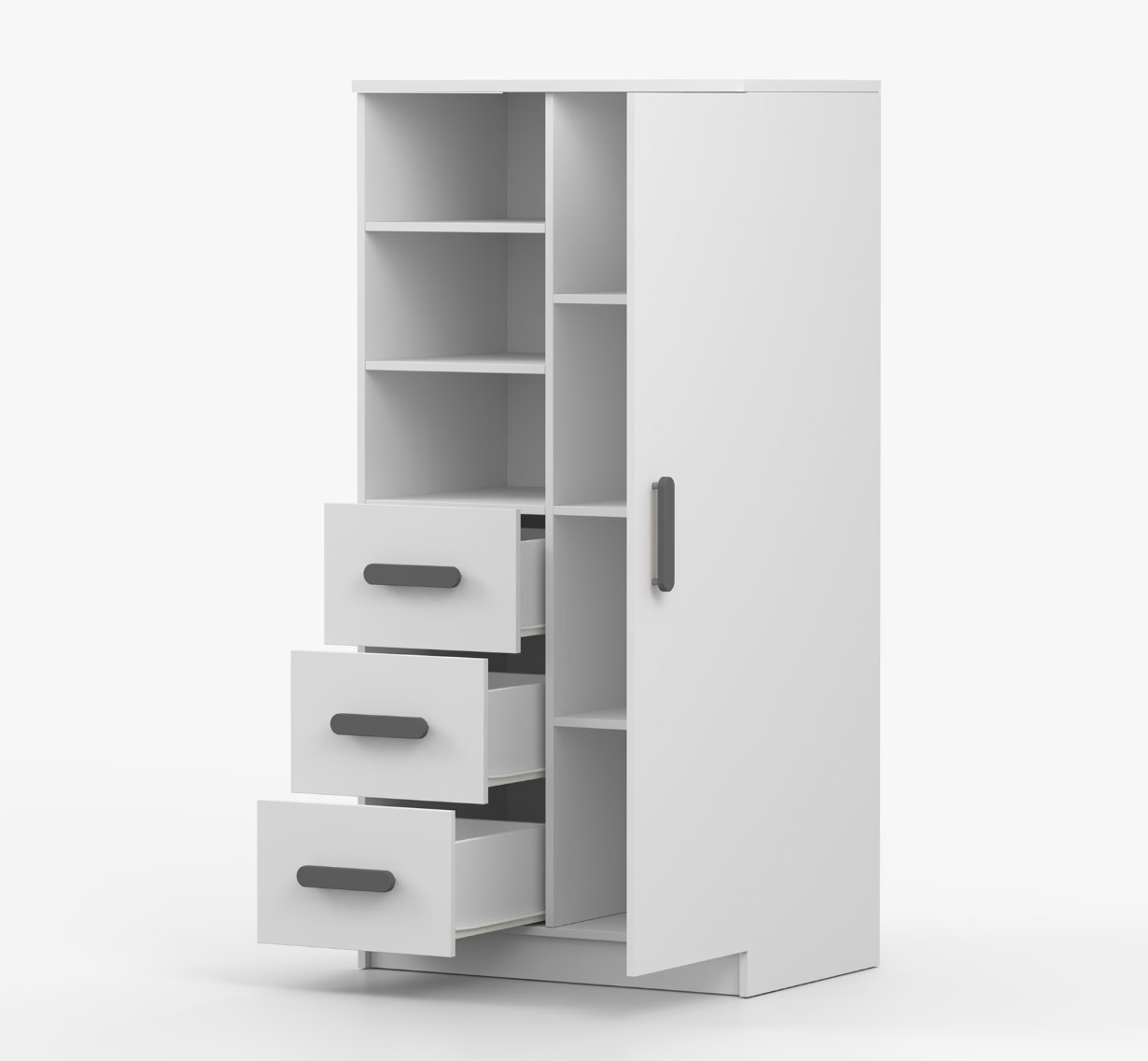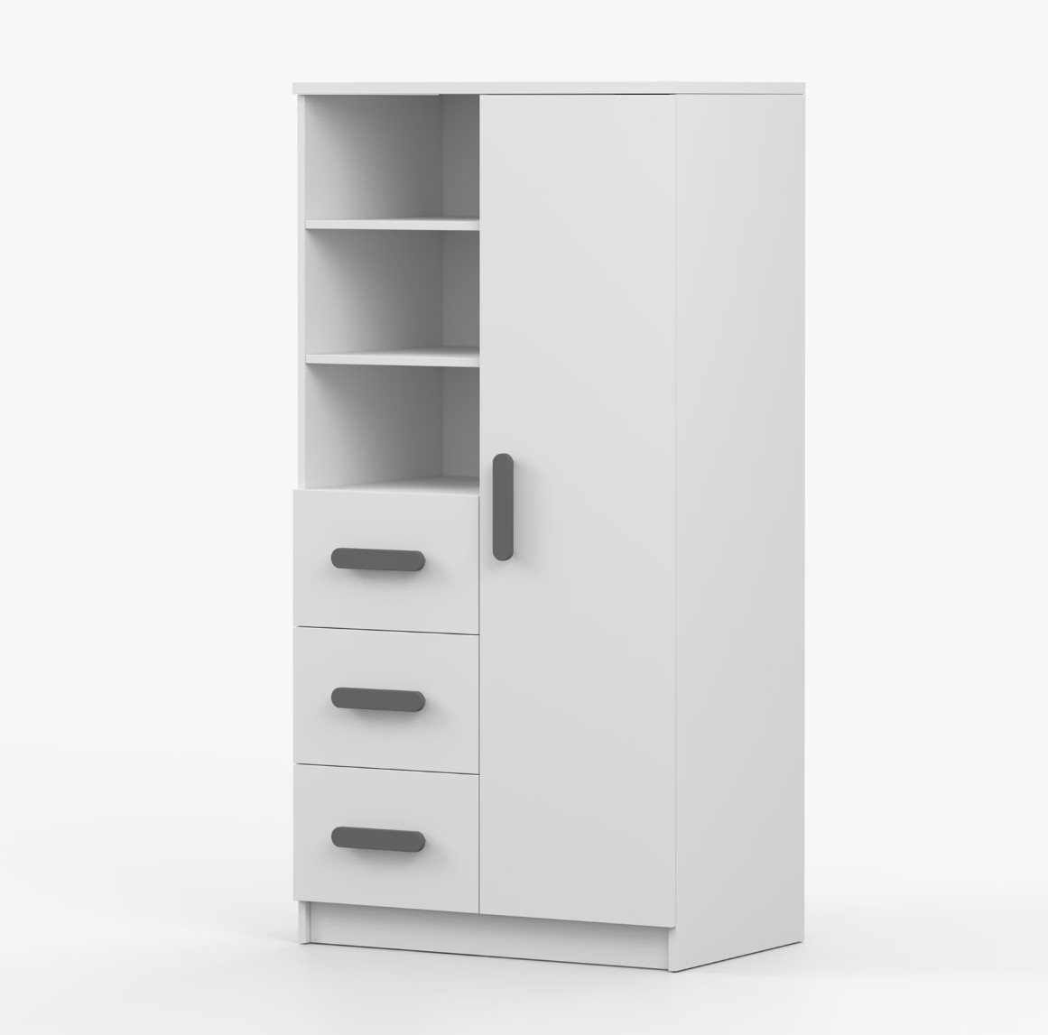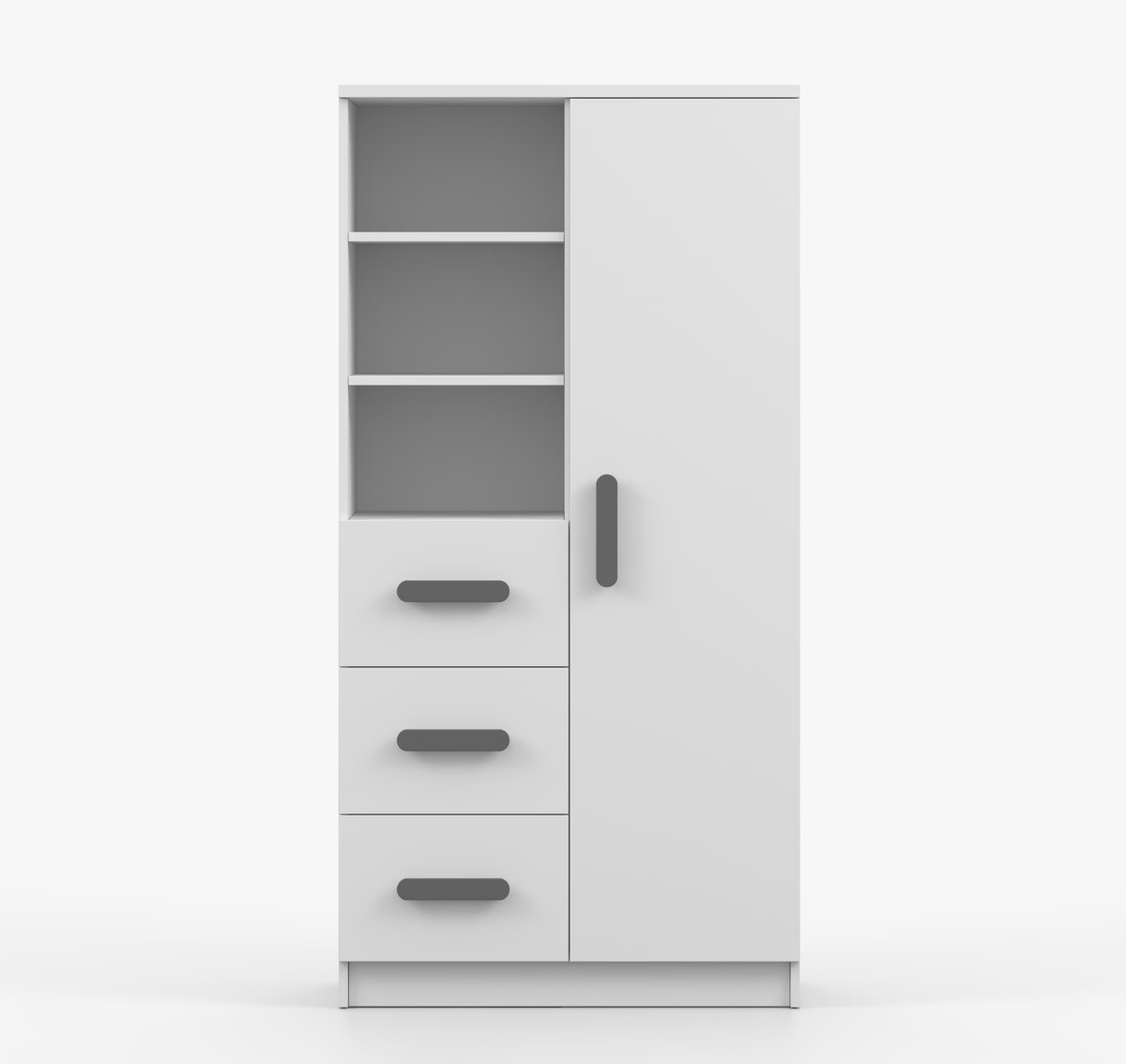 Regál SMYK nabízí praktické a všestranné úložné řešení pro každou domácnost. Je složen z dvou polic, tří prostorných zásuvek a boční skříňky s vnitřními policemi, což umožňuje dostatek prostoru pro uložení knih, oblečení a dalších věcí. Regál je vyroben z kvalitní laminované desky o tloušťce 16 mm s odolnou ABS lištou, chránící hrany regálu před mechanickým poškozením. Barevné úchytky z PVC dodávají tomuto praktickému kusu nábytku zajímavý designový prvek.
