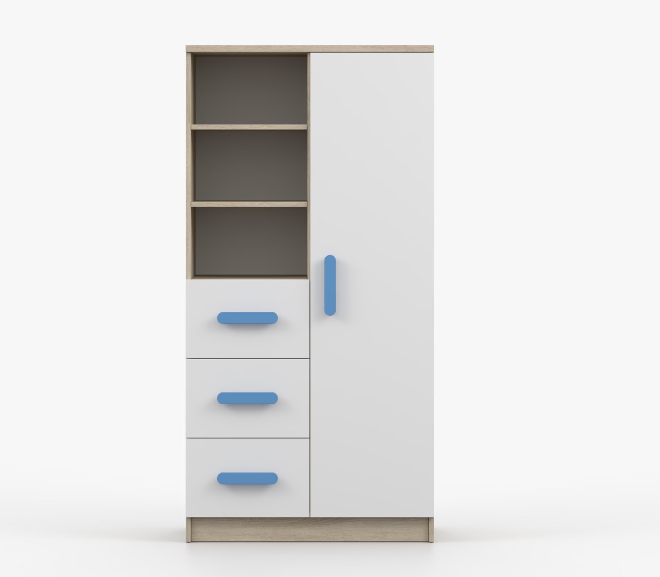 Regál SMYK nabízí praktické a všestranné úložné řešení pro každou domácnost. Je složen z dvou polic, tří prostorných zásuvek a boční skříňky s vnitřními policemi, což umožňuje dostatek prostoru pro uložení knih, oblečení a dalších věcí. Regál je vyroben z kvalitní laminované desky o tloušťce 16 mm s odolnou ABS lištou, chránící hrany regálu před mechanickým poškozením. Barevné úchytky z PVC dodávají tomuto praktickému kusu nábytku zajímavý designový prvek.
