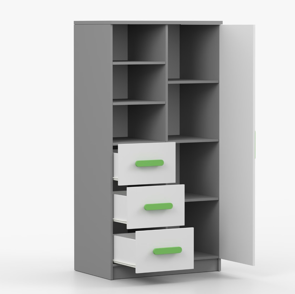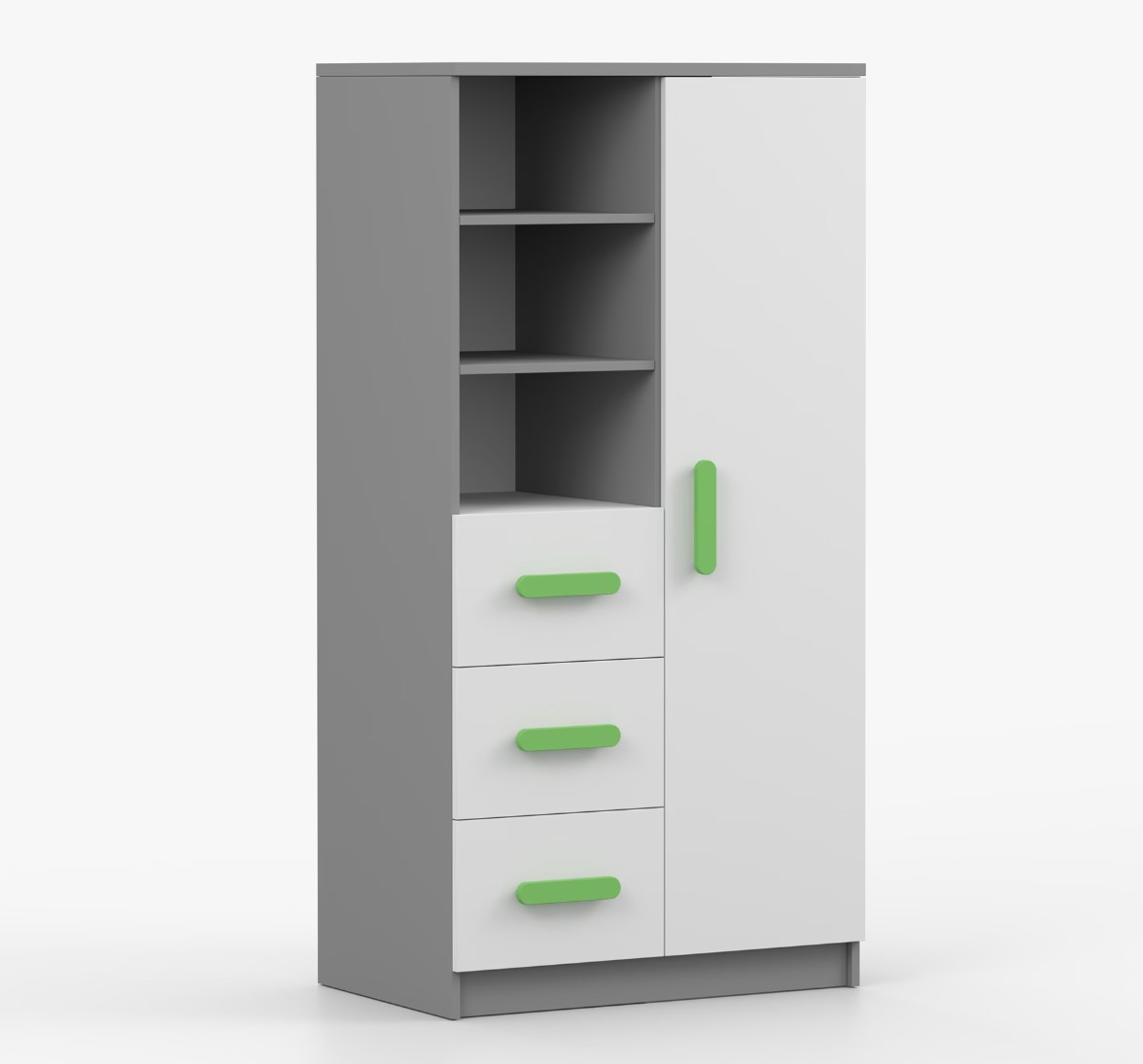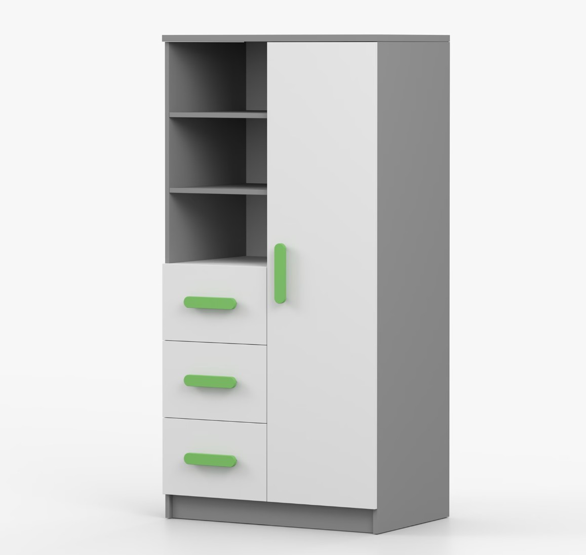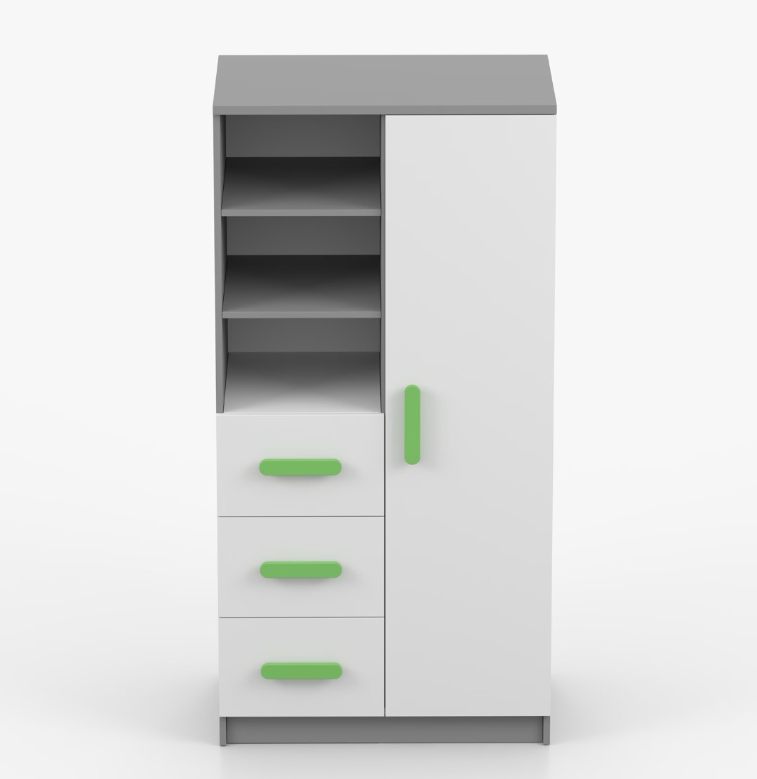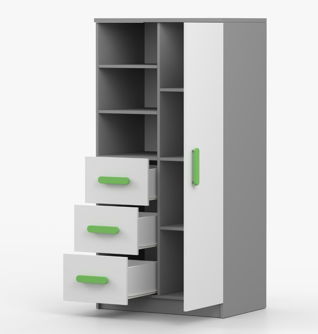 Regál SMYK nabízí praktické a všestranné úložné řešení pro každou domácnost. Je složen z dvou polic, tří prostorných zásuvek a boční skříňky s vnitřními policemi, což umožňuje dostatek prostoru pro uložení knih, oblečení a dalších věcí. Regál je vyroben z kvalitní laminované desky o tloušťce 16 mm s odolnou ABS lištou, chránící hrany regálu před mechanickým poškozením. Barevné úchytky z PVC dodávají tomuto praktickému kusu nábytku zajímavý designový prvek.