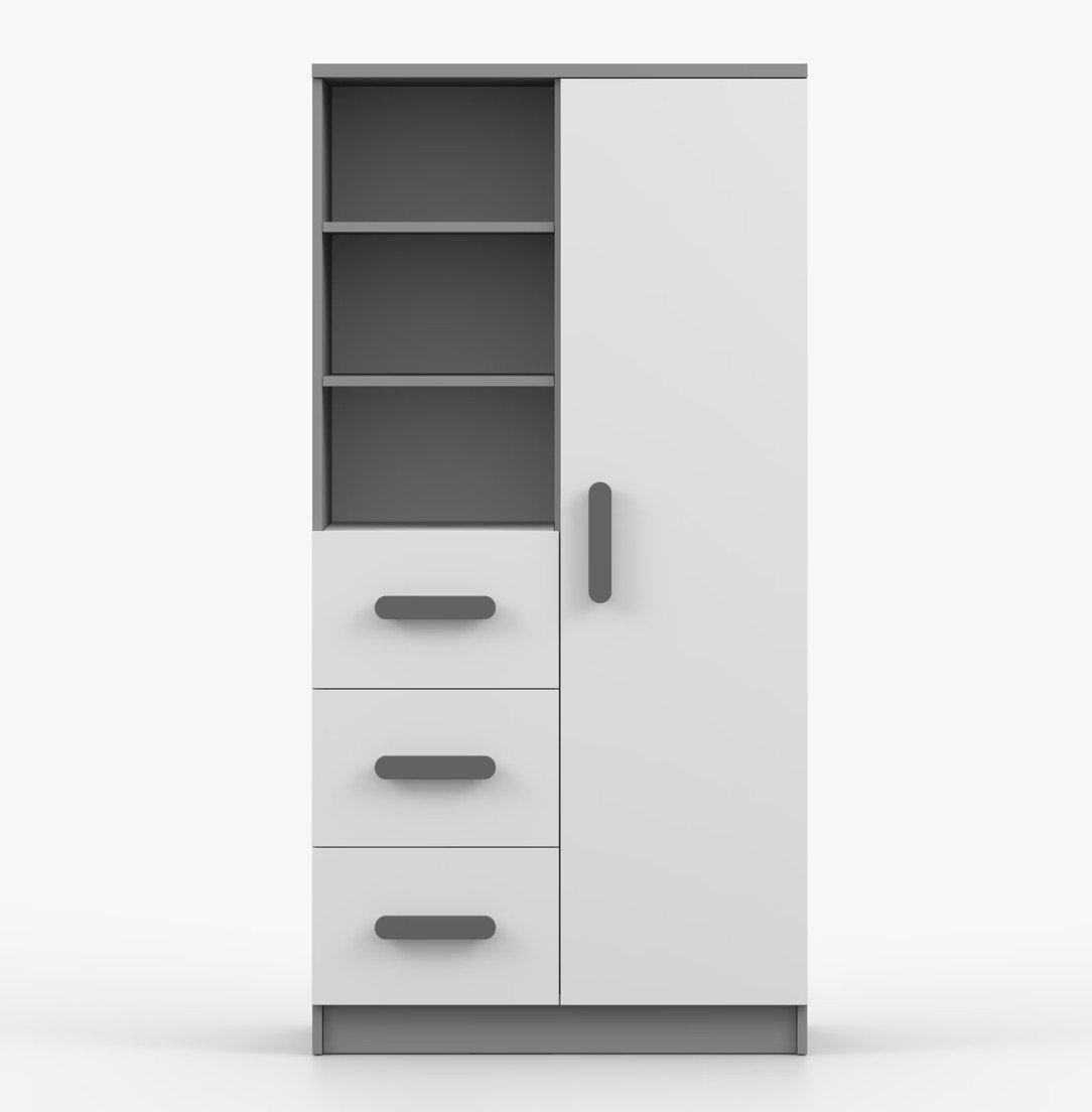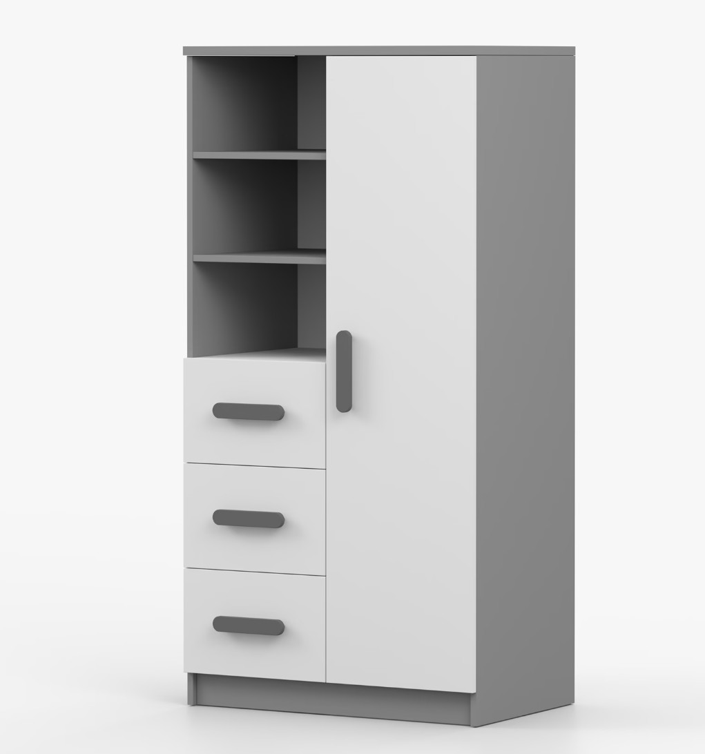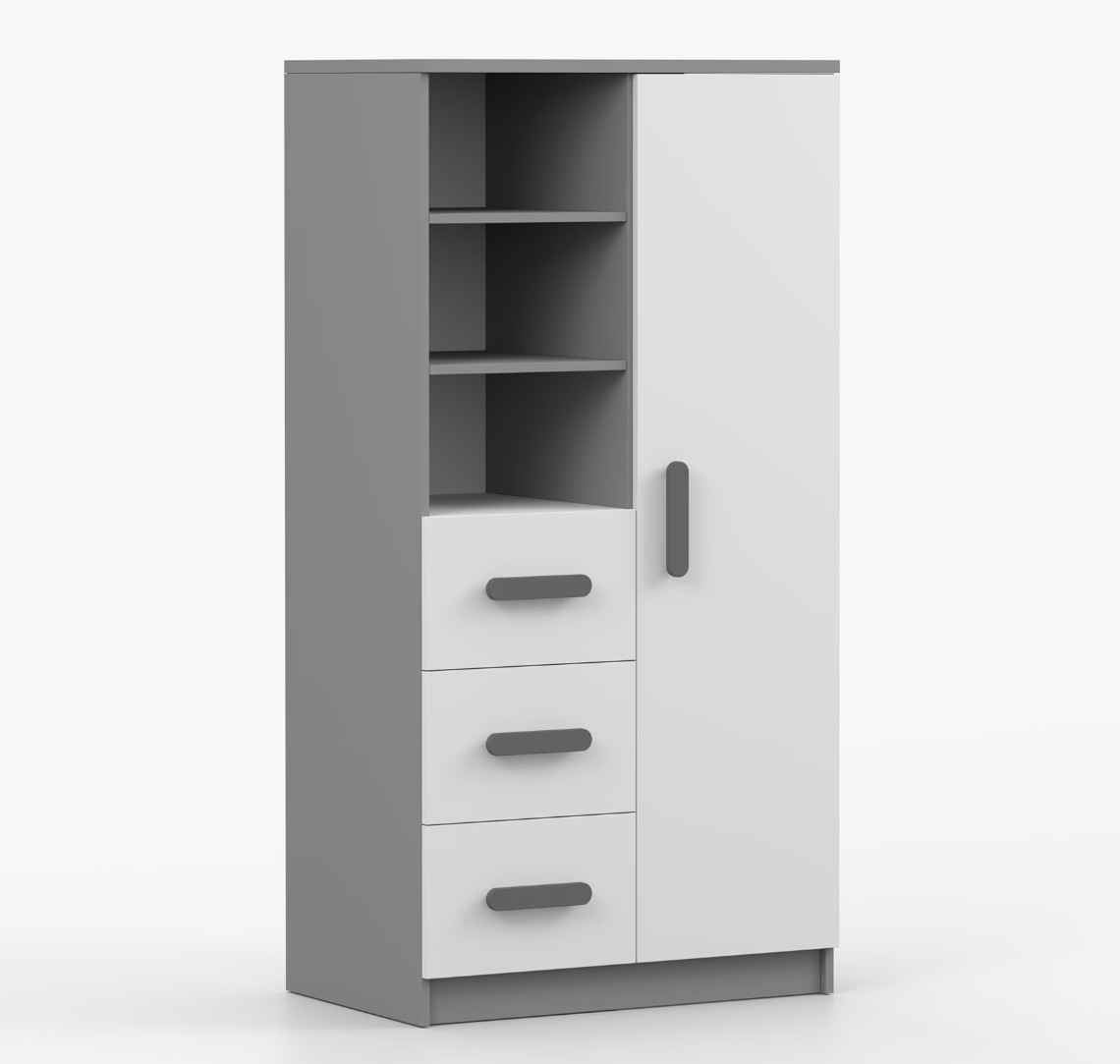 Regál SMYK nabízí praktické a všestranné úložné řešení pro každou domácnost. Je složen z dvou polic, tří prostorných zásuvek a boční skříňky s vnitřními policemi, což umožňuje dostatek prostoru pro uložení knih, oblečení a dalších věcí. Regál je vyroben z kvalitní laminované desky o tloušťce 16 mm s odolnou ABS lištou, chránící hrany regálu před mechanickým poškozením. Barevné úchytky z PVC dodávají tomuto praktickému kusu nábytku zajímavý designový prvek.